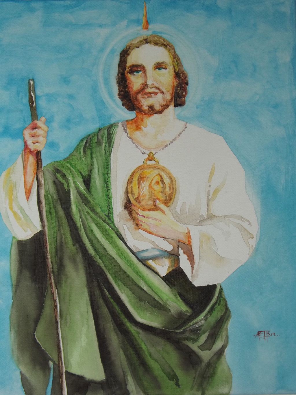 Description: A painting of jesus holding a golden medal and a staff of fire in his hand.