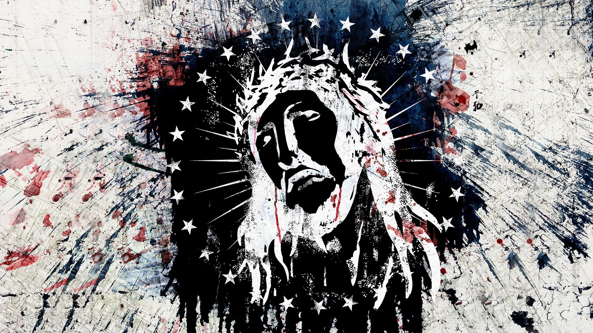 Description: A painting of jesus with stars and a crown of glory on it's head and a black background.