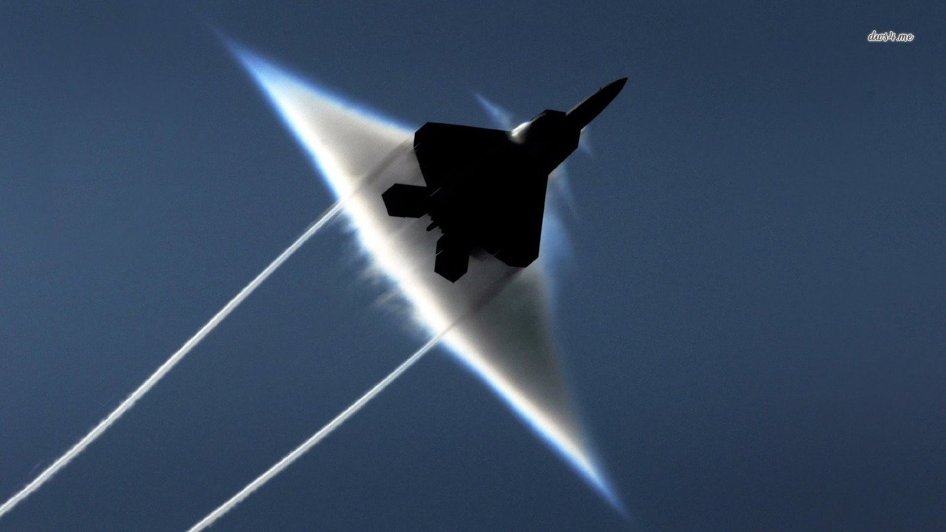 Description: A jet flying through a blue sky with two contrails in the sky behind it and a white streak in the sky.