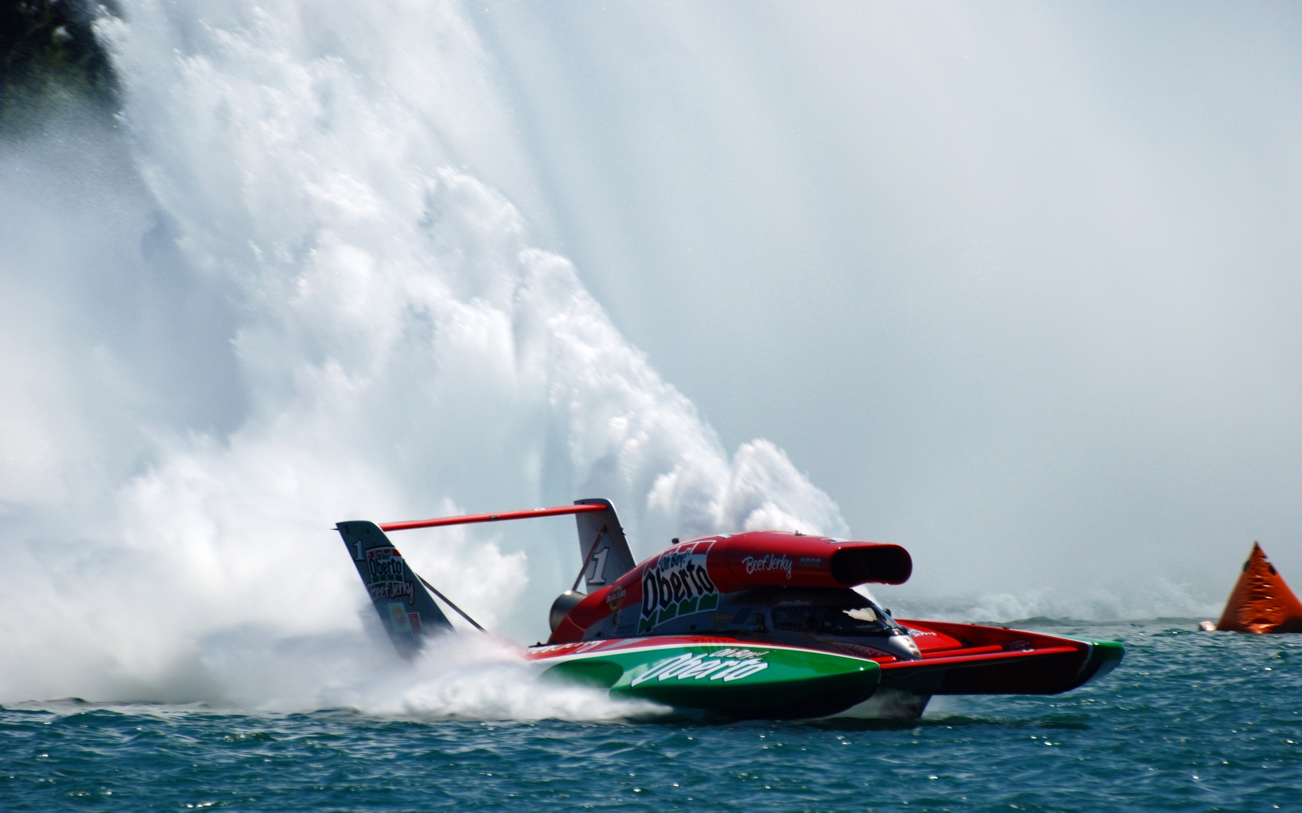 Description: A jet boat is in the water near a waterfall and a boat is in the water with a flag on it.