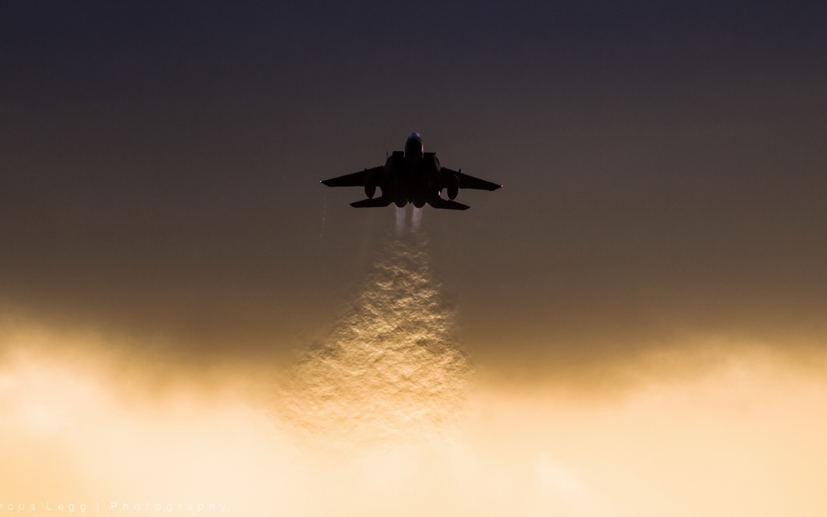 Description: A jet flying through a cloudy sky with a jet trail behind it in the distance.