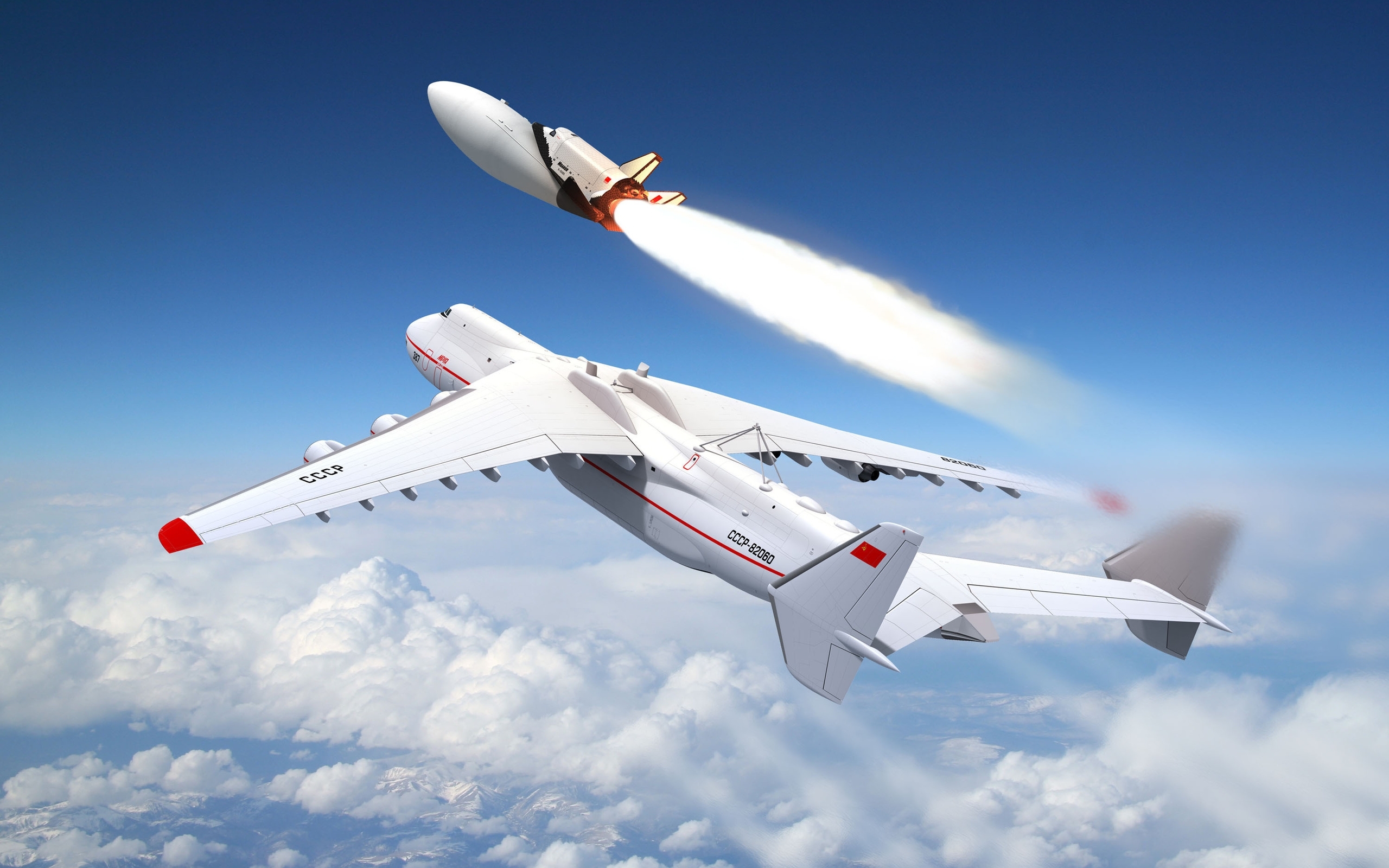 Description: A jet flying through the air next to a rocket in the sky above clouds and a cloud filled sky.