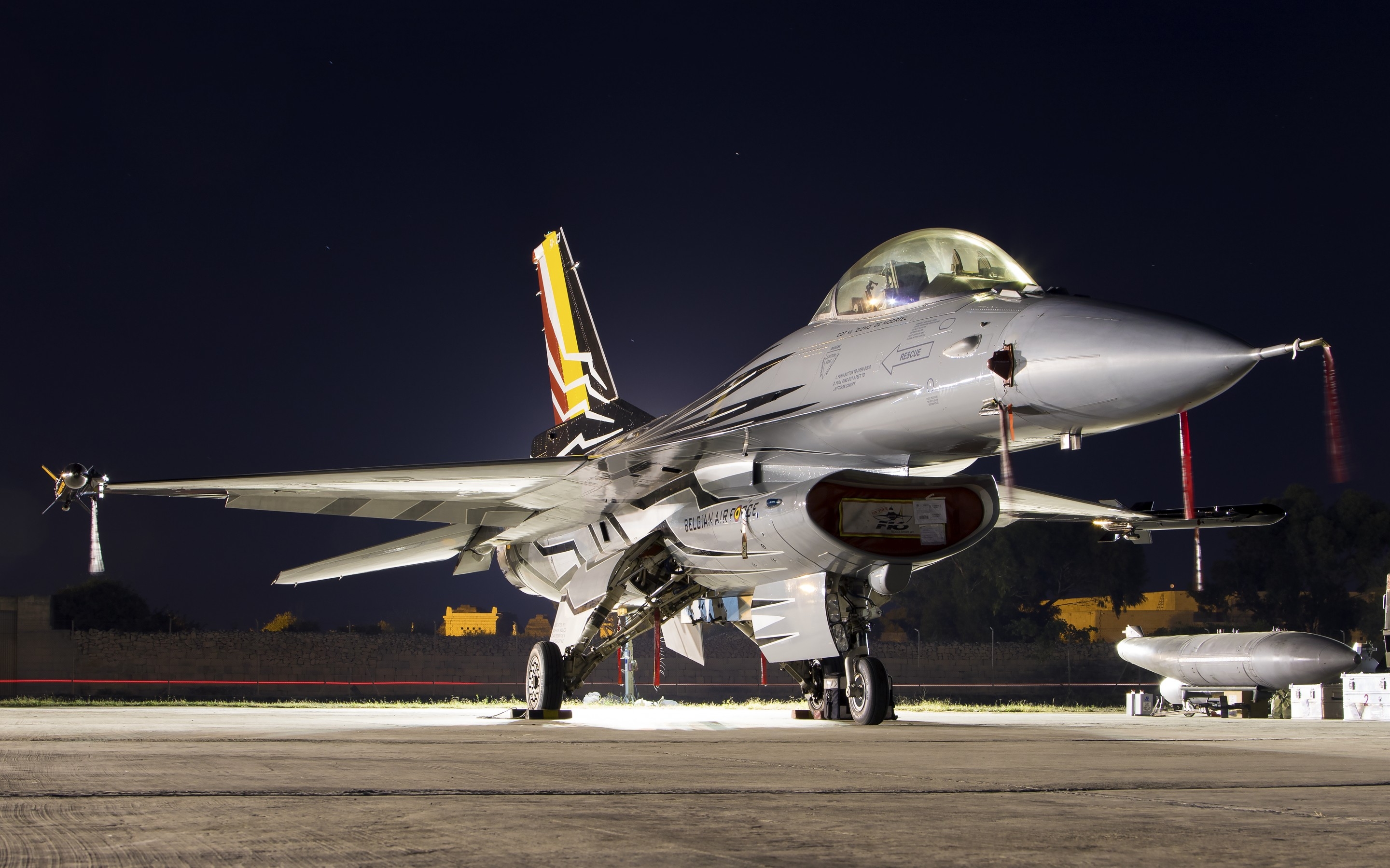 Description: A jet fighter sitting on top of an airport tarmac at night time with lights on the side of it.
