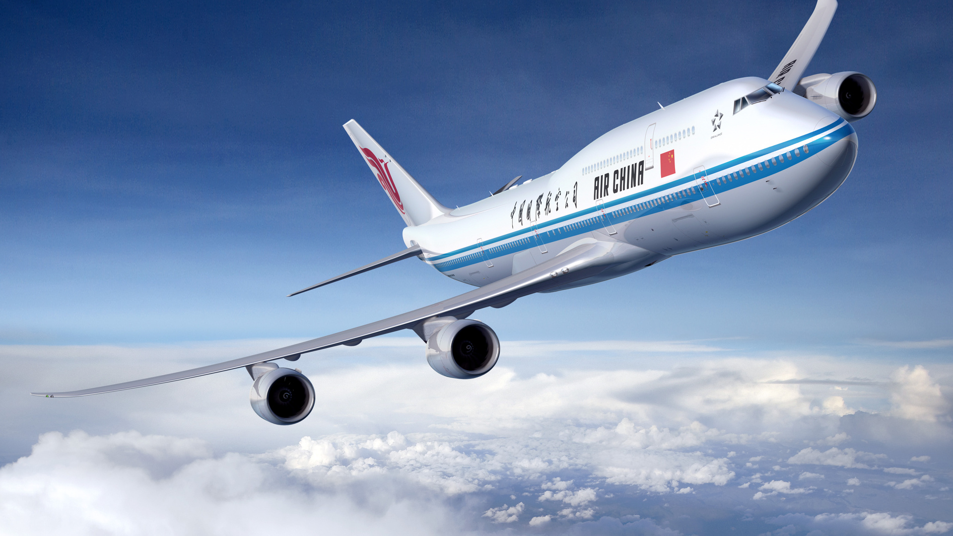 Description: A large jetliner flying through a blue sky above clouds and clouds below it is a red.