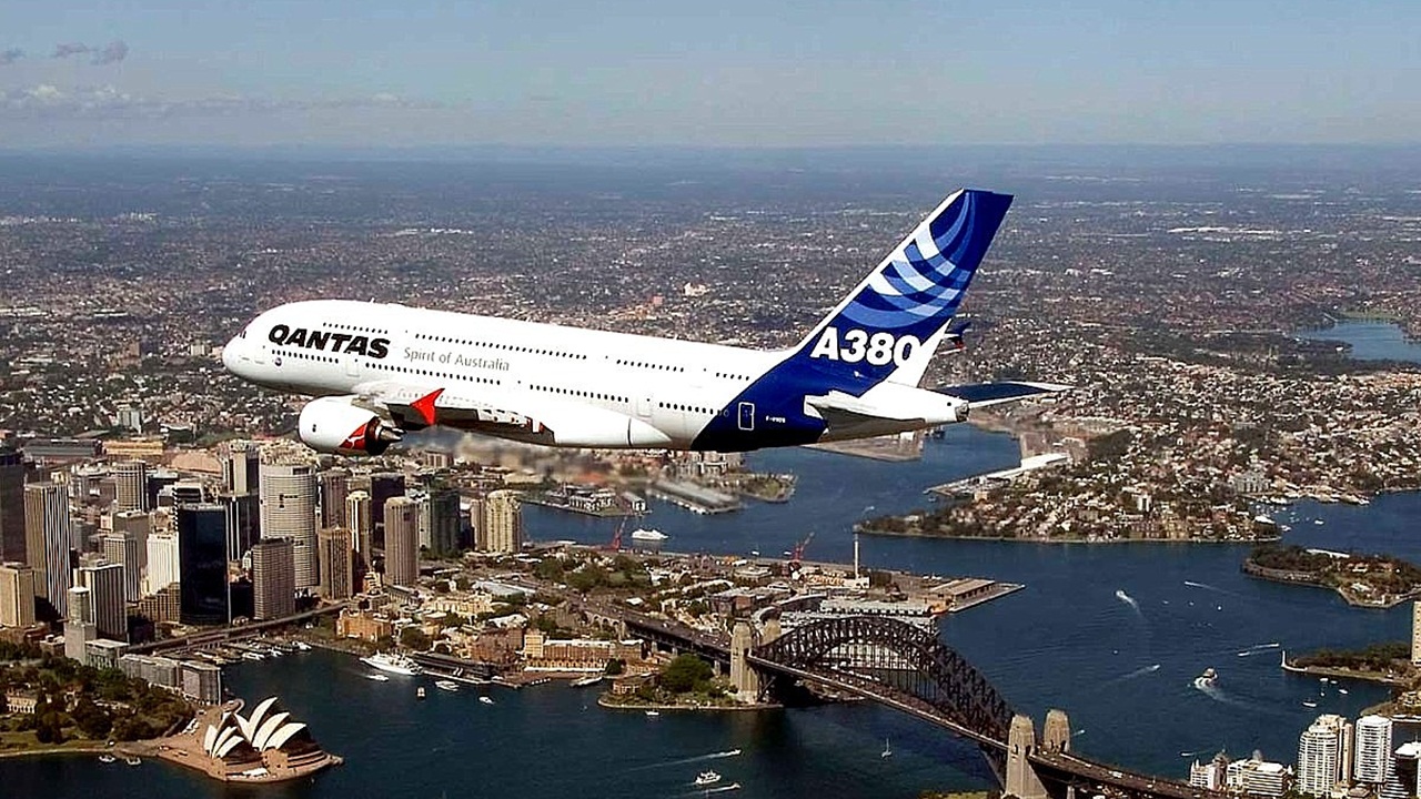 Description: A large jetliner flying over a city next to a river and bridge in the sky with a bridge in the background.