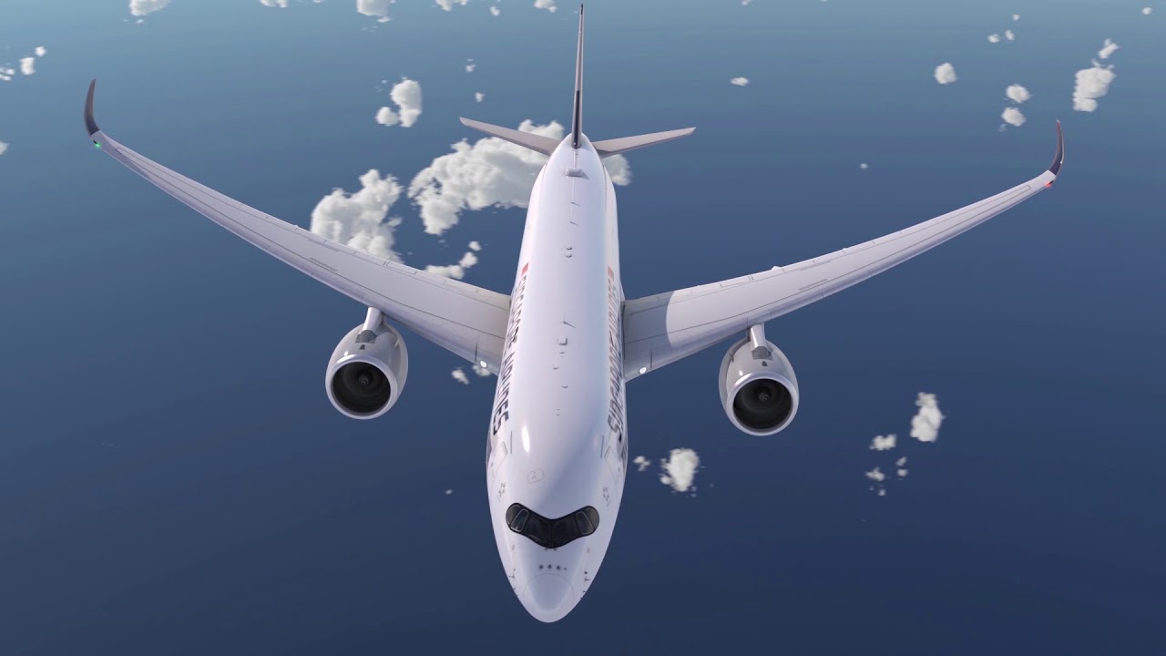 Description: A large jetliner flying through a blue sky above the clouds and water with a camera attached to it.
