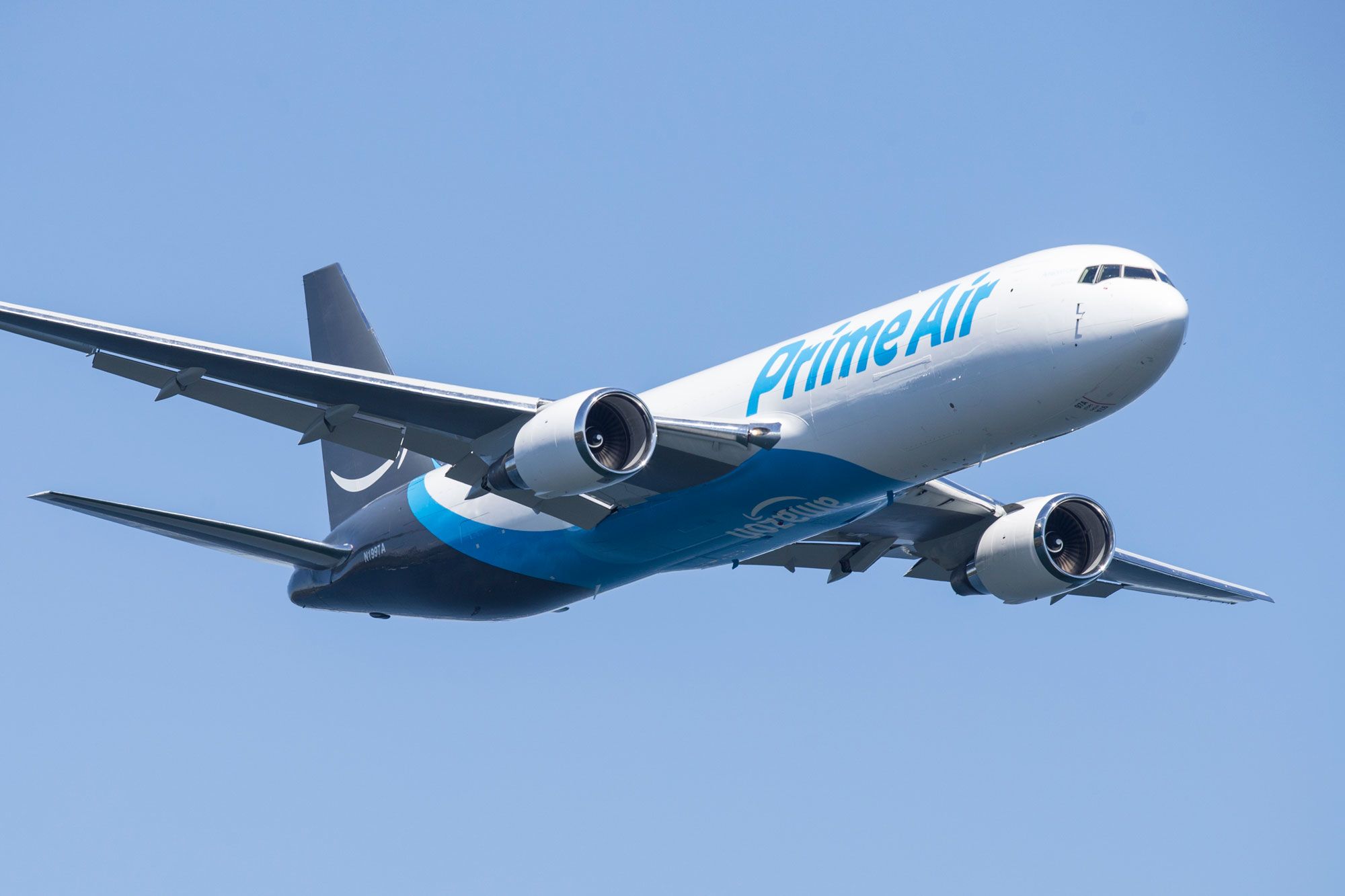 Description: A large jetliner flying through a blue sky with its landing gear down and its landing gear down and the tail end of the plane.