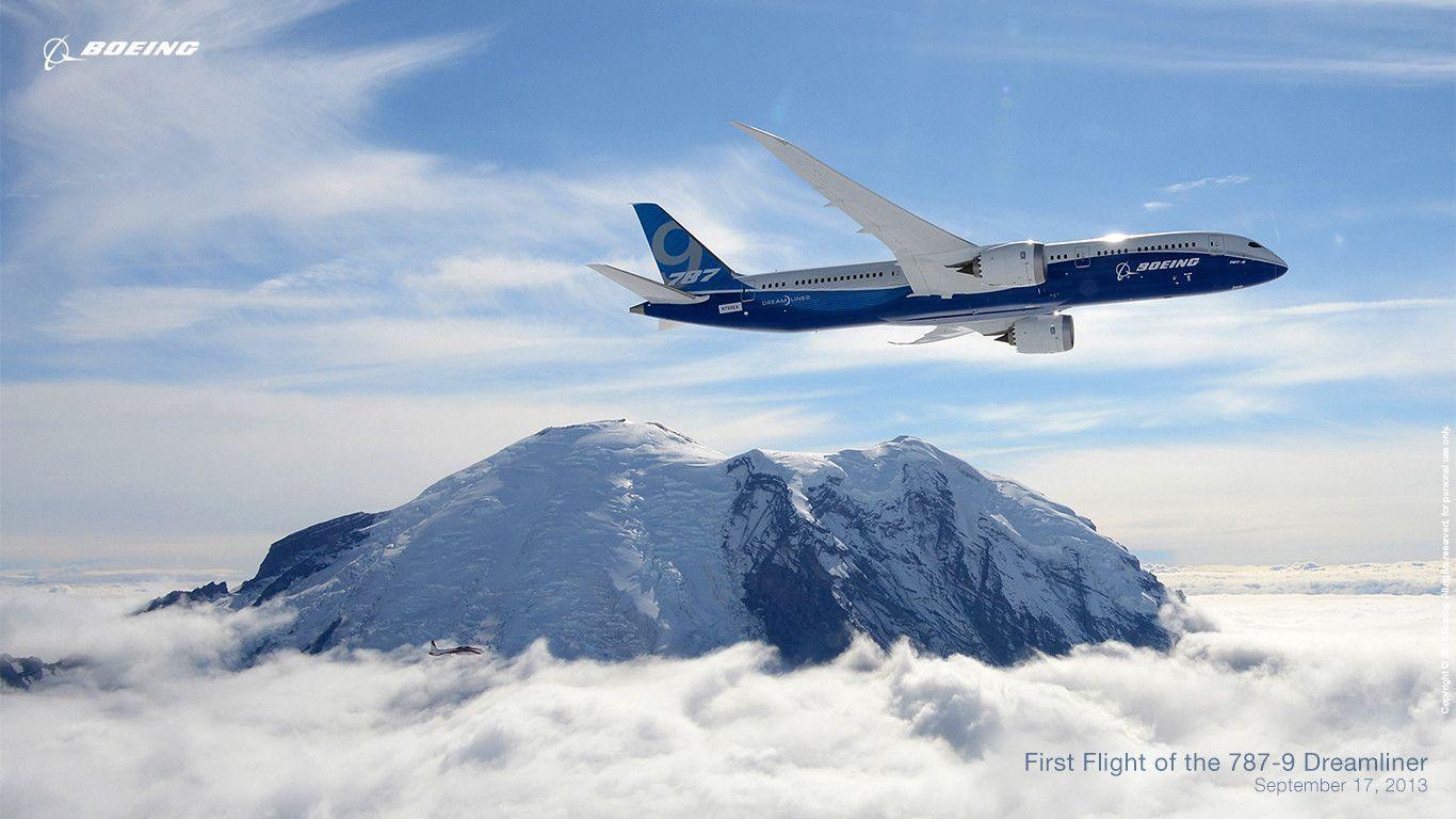Description: A large jetliner flying over a mountain covered in clouds and snow in the sky with a blue sky.