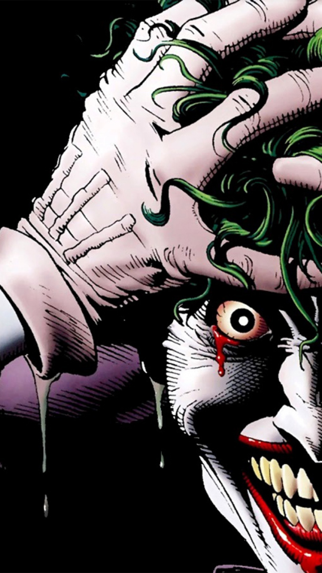 Description: A close up of a joker face with a knife in his hand and blood dripping from his mouth and hands.
