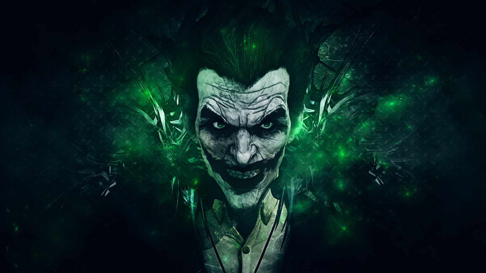 Description: A joker with green eyes and a suit on.