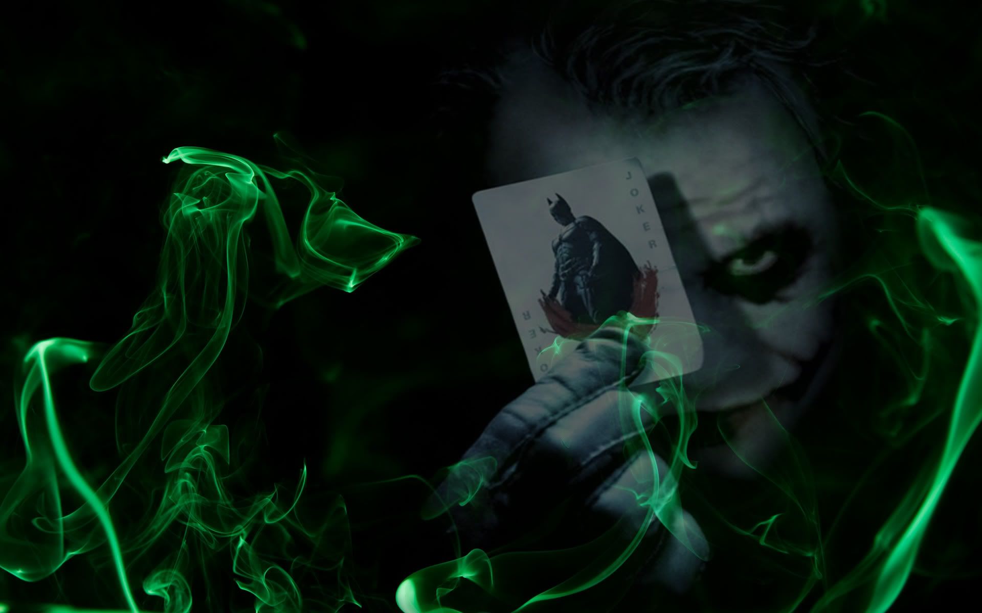 Description: A joker holding a card in his hand with green smoke surrounding it and a dark background with green smoke.