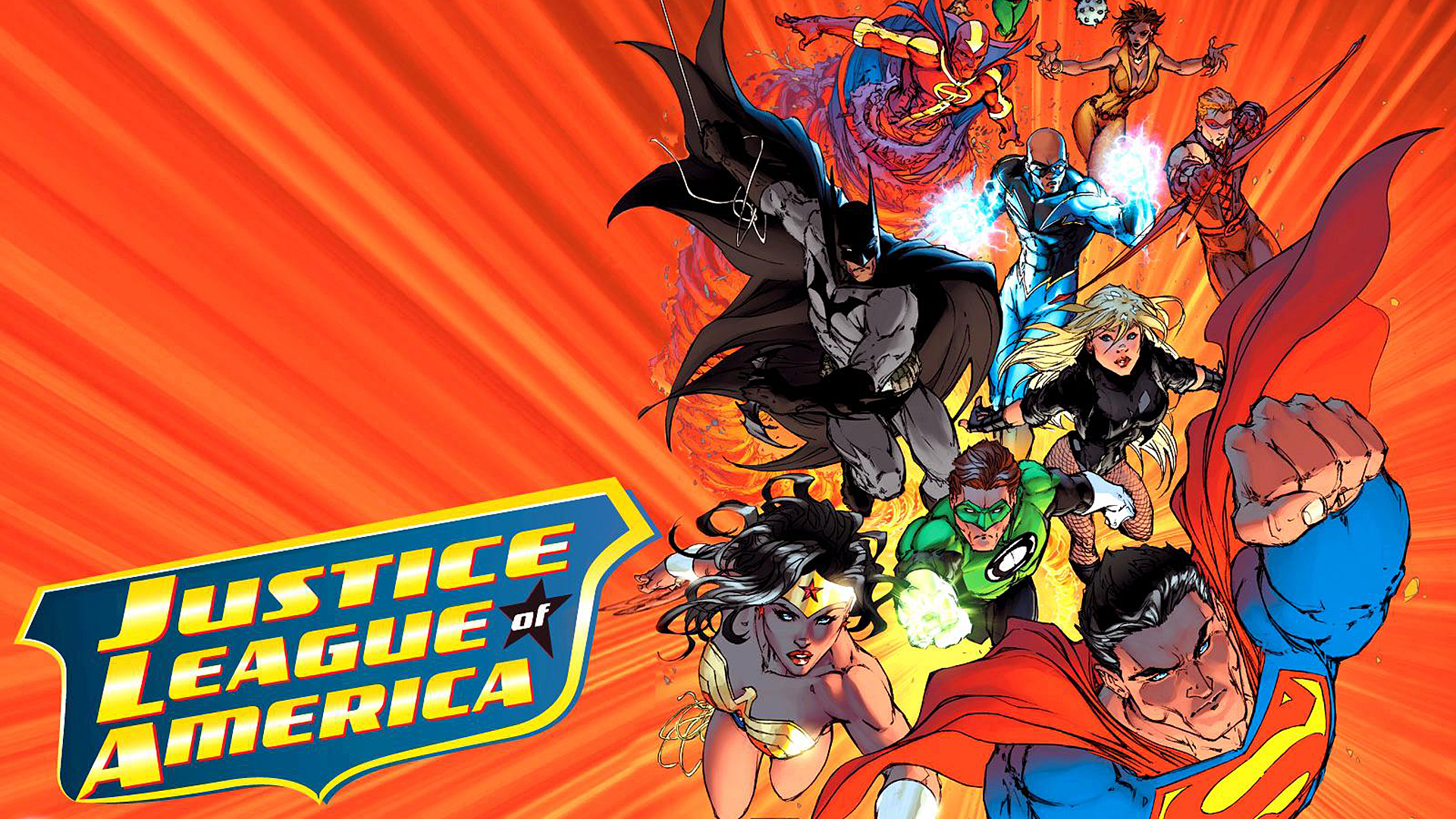 Description: A group of superheros are in a group together with the words justice league of america on the background.
