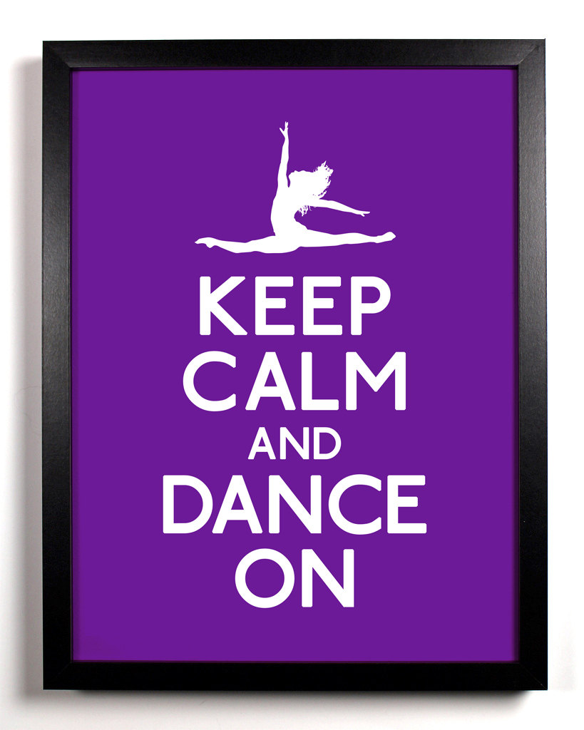 Description: A purple poster with a white text that says keep calm and dance on on it.