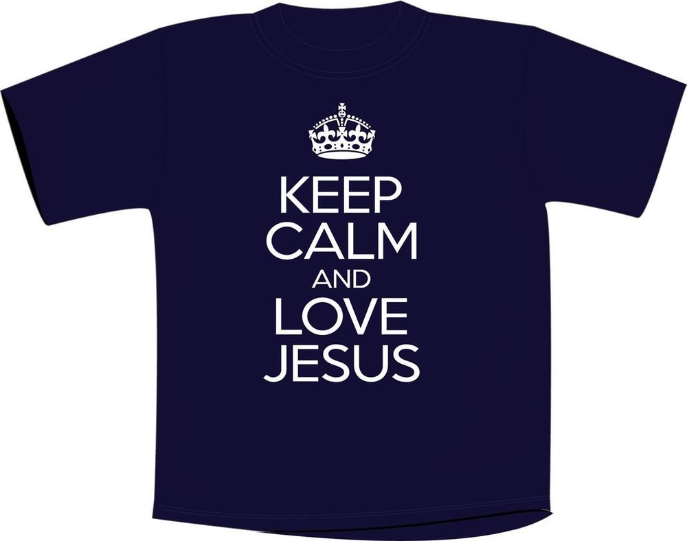 Description: A t - shirt with the words keep calm and love jesus on it in white letters on a navy blue background.