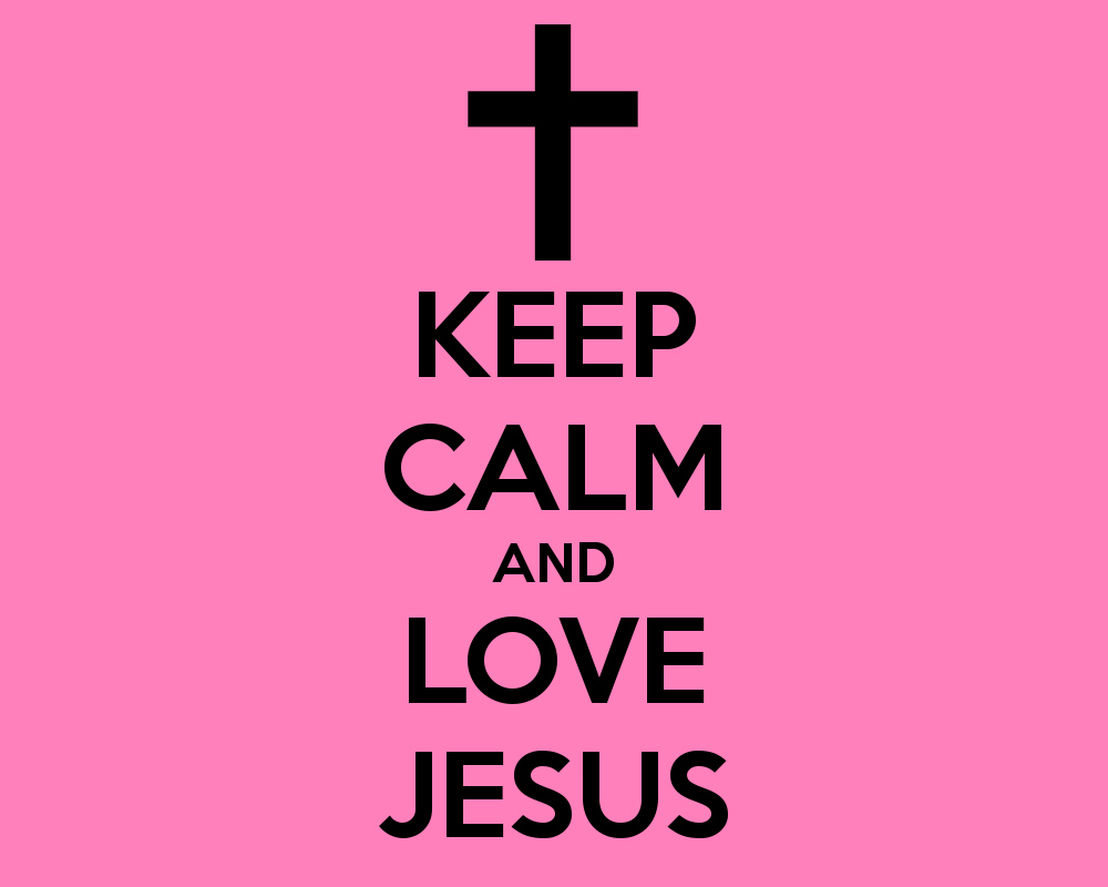 Description: A cross on a pink background with the words keep calm and love jesus written below it in black on a pink background.