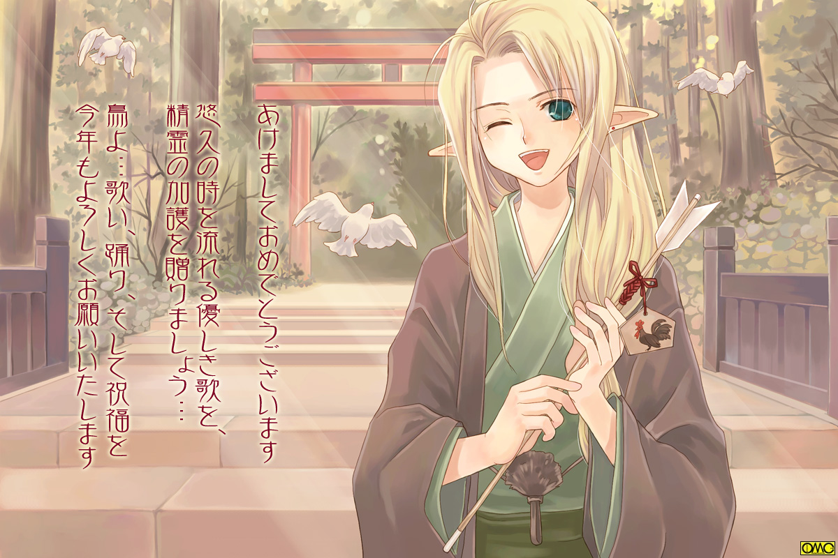 Description: A woman in a kimono holding a flower in front of a forest with birds flying around her and a gate with a red sign that says.