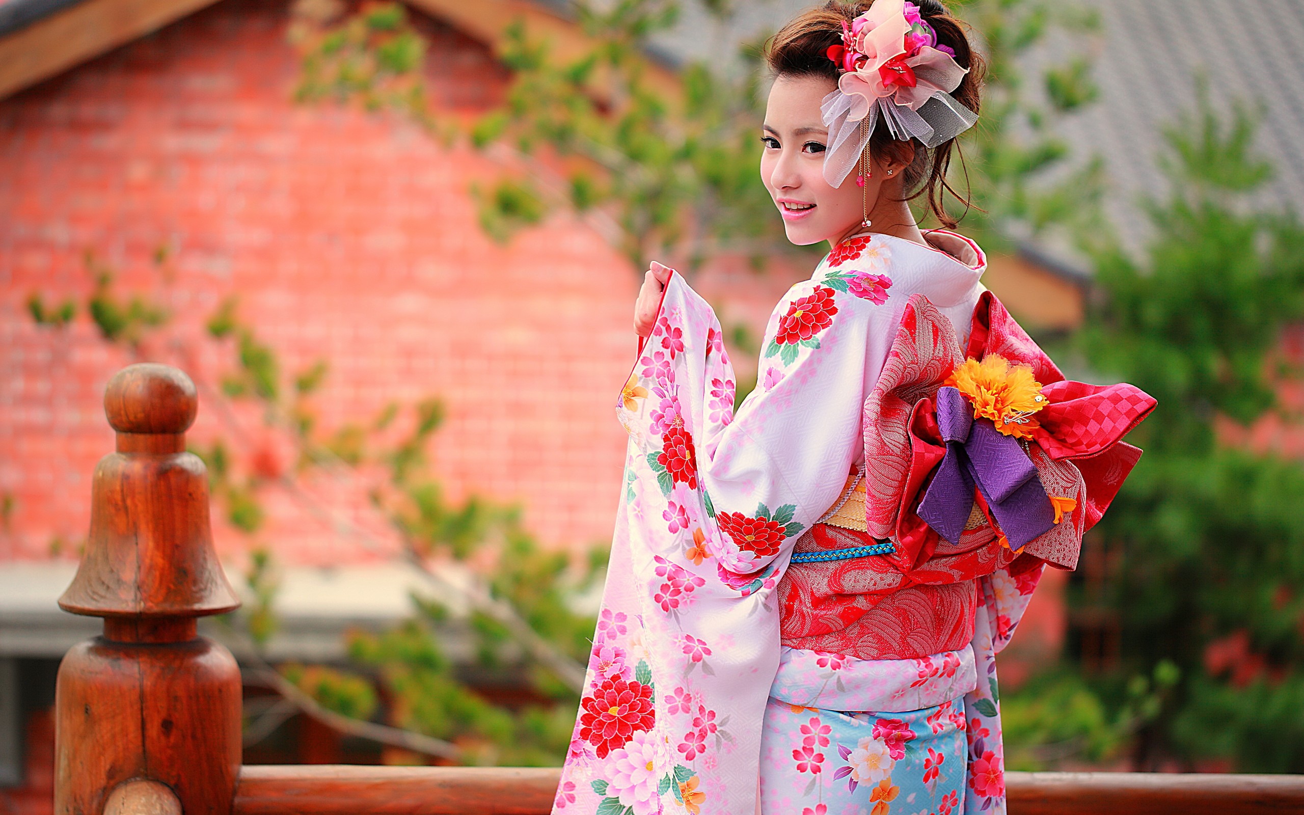 Description: A woman in a kimono standing on a balcony with a tree in the background and a house in the background.