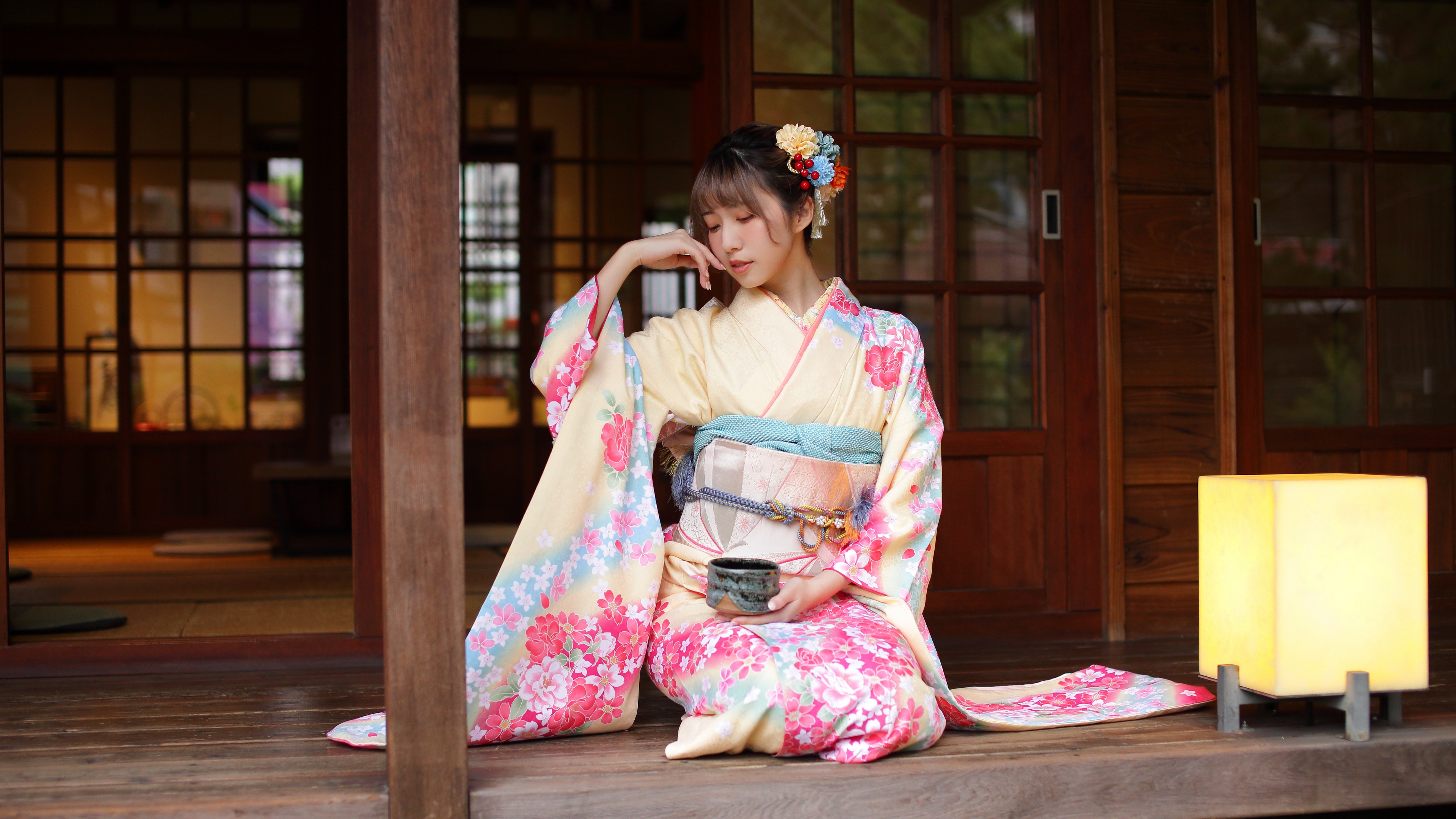 Description: A woman in a kimono sitting on a porch next to a candle and a lantern light in front of her.