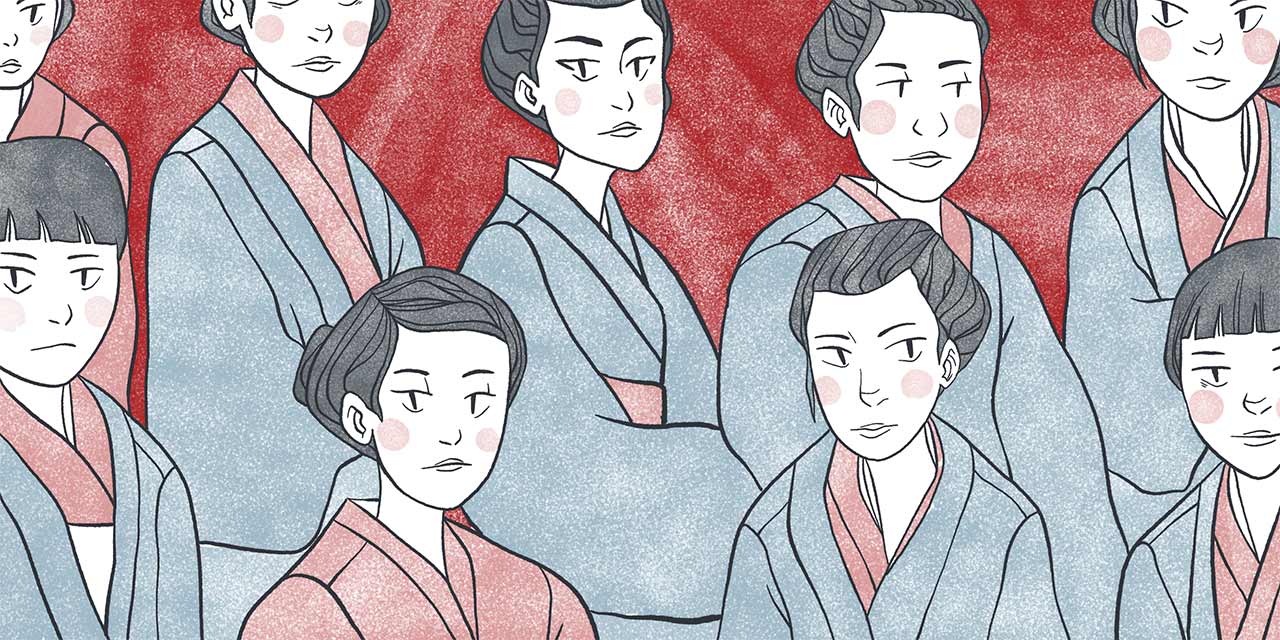 Description: A group of people in kimonos standing in a line with one woman looking at the camera and the other looking at the camera.
