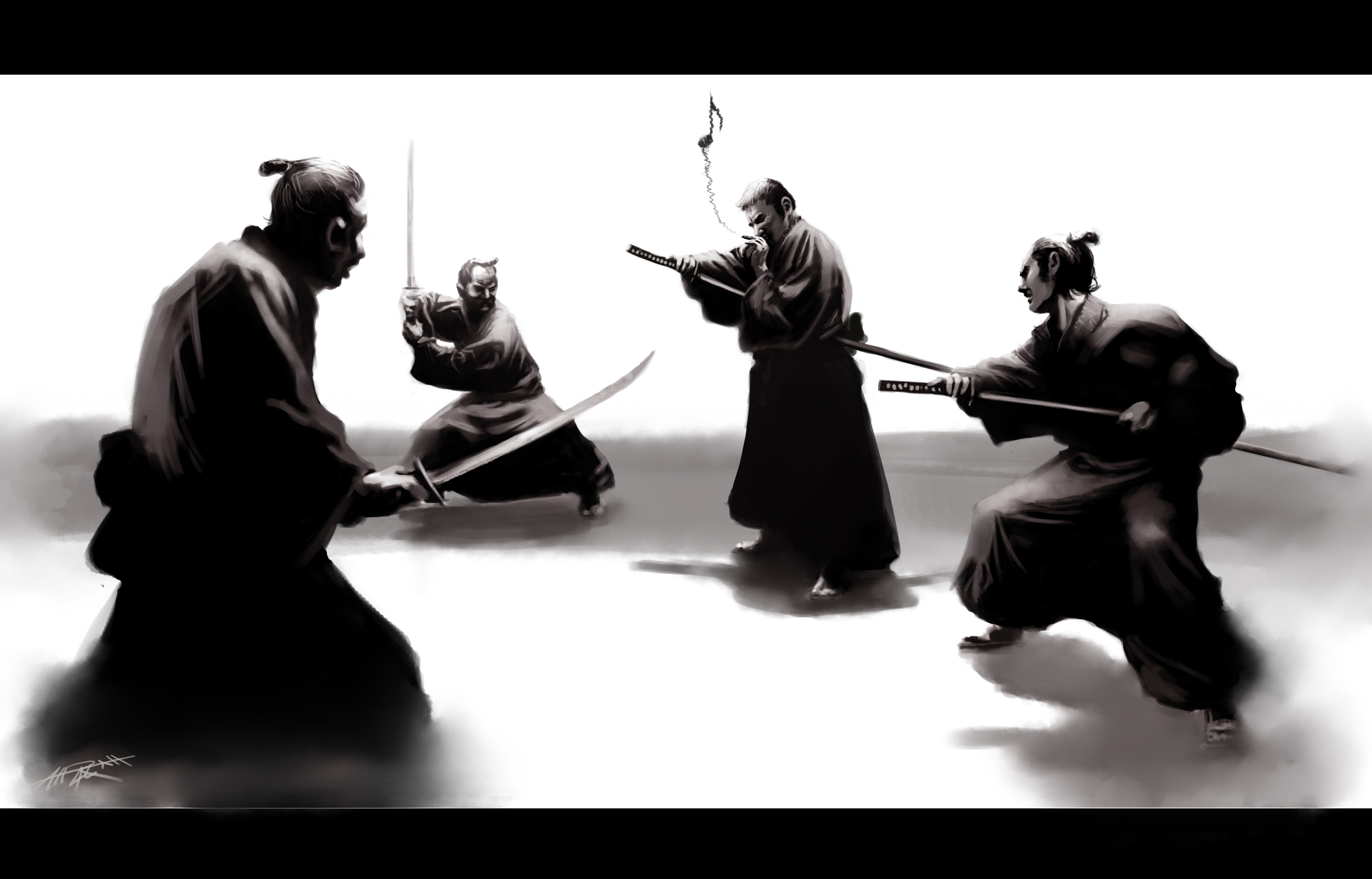 Description: A group of people in kimonos holding swords and wearing masks and holding swords in their hands.