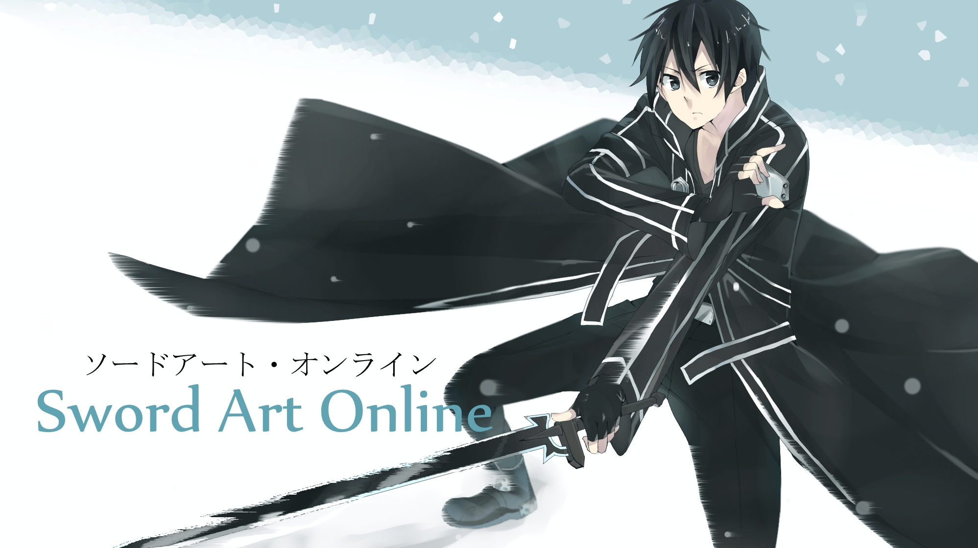 Description: A man in a black outfit holding a sword in the snow with snow falling around him and the words sword art online written below.