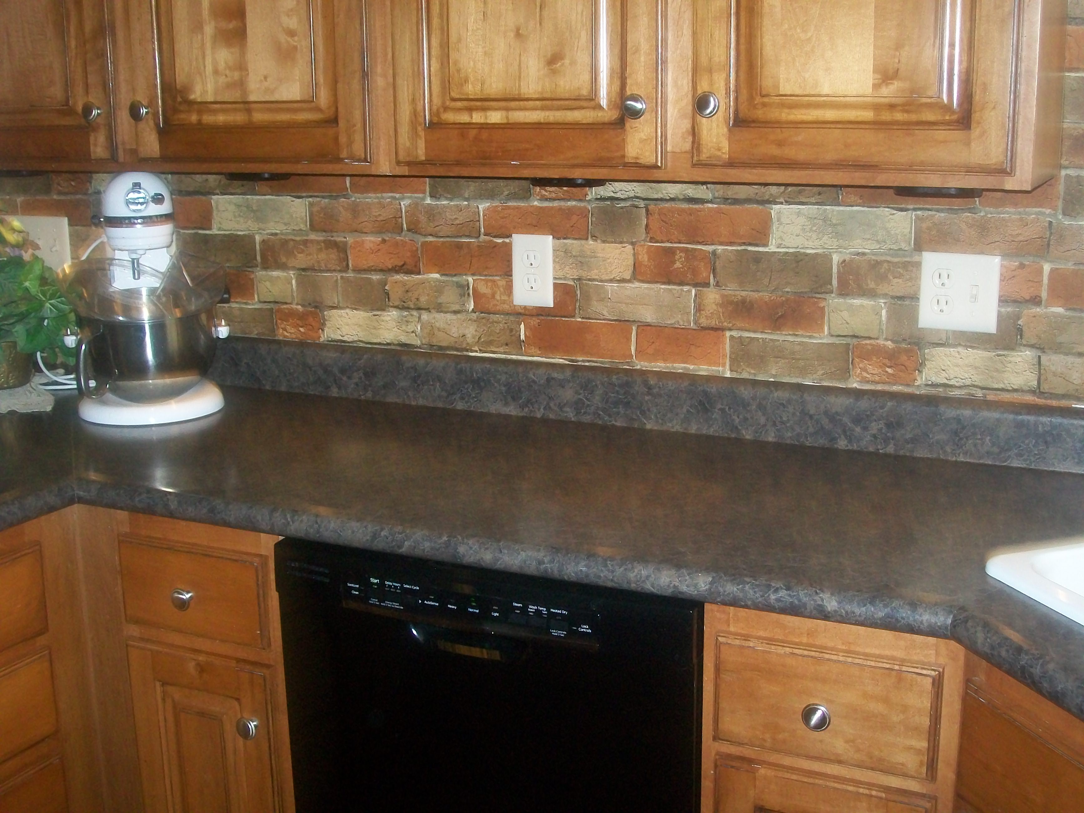 Description: A kitchen with a black dishwasher and a brick wall behind it and a sink and a dishwasher.