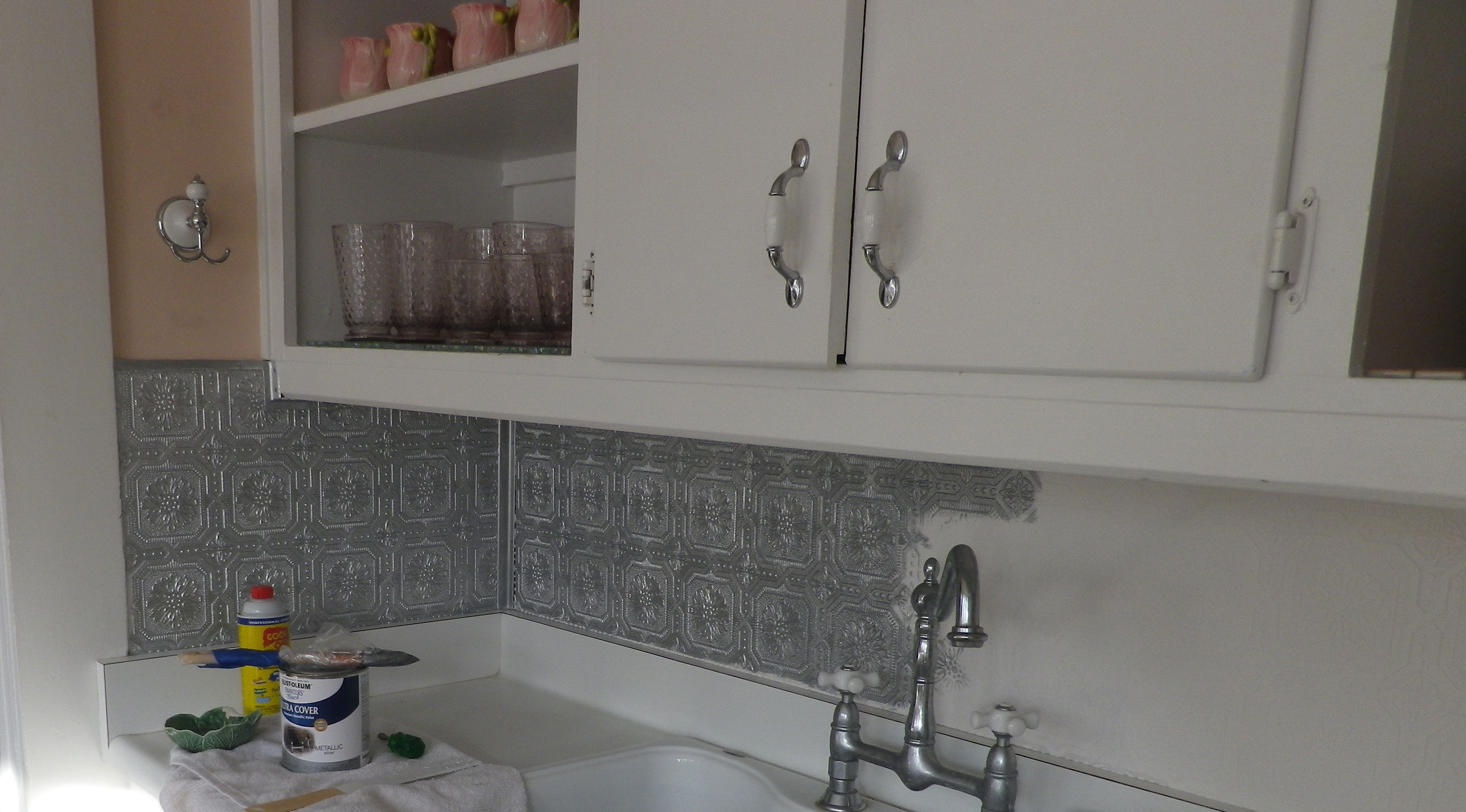 Description: A kitchen with a sink and a cabinet with glass doors on it and a counter with a spray paint and a can of paint.