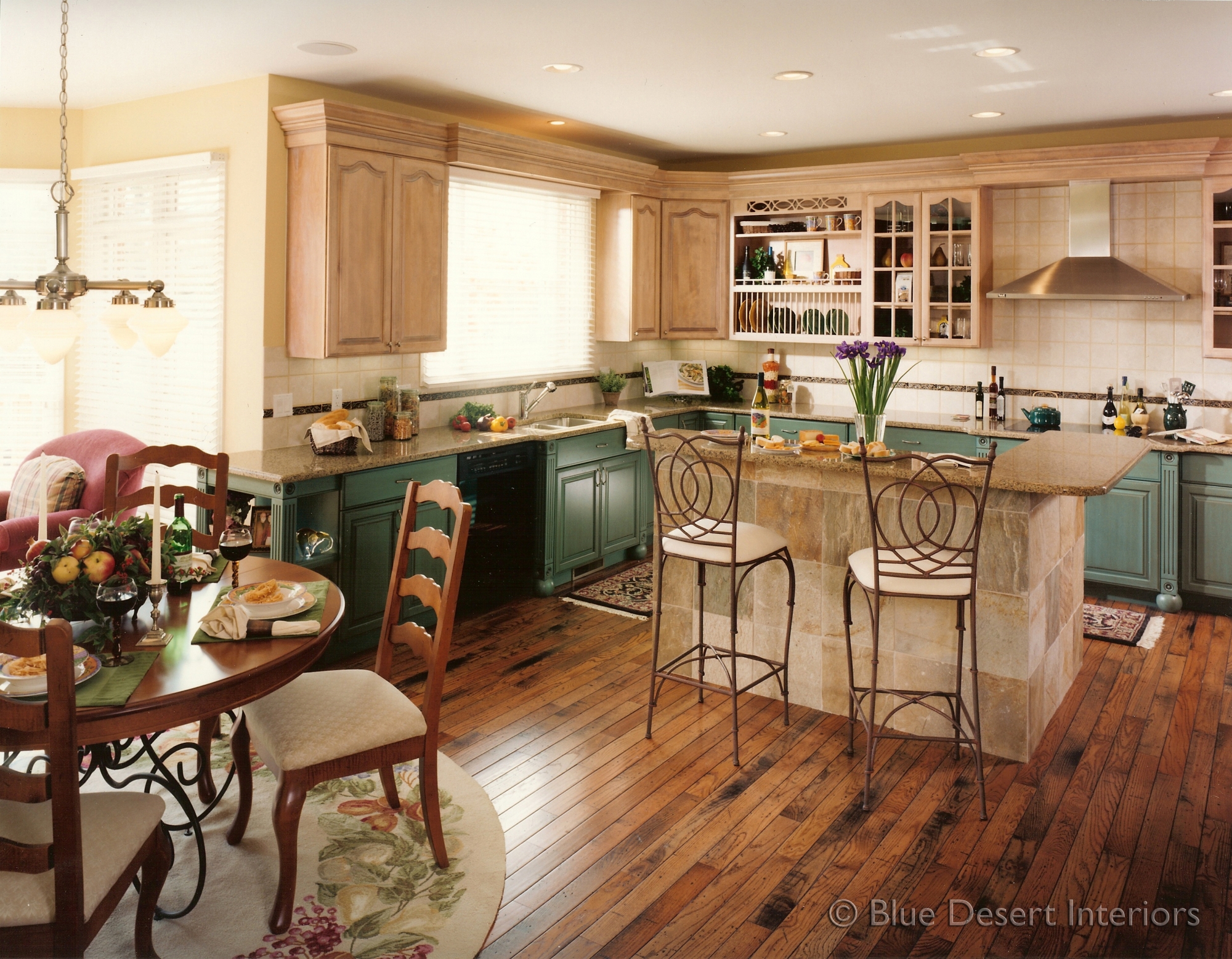 Description: A kitchen with a table and chairs and a center island with a bar stools and a table with chairs.
