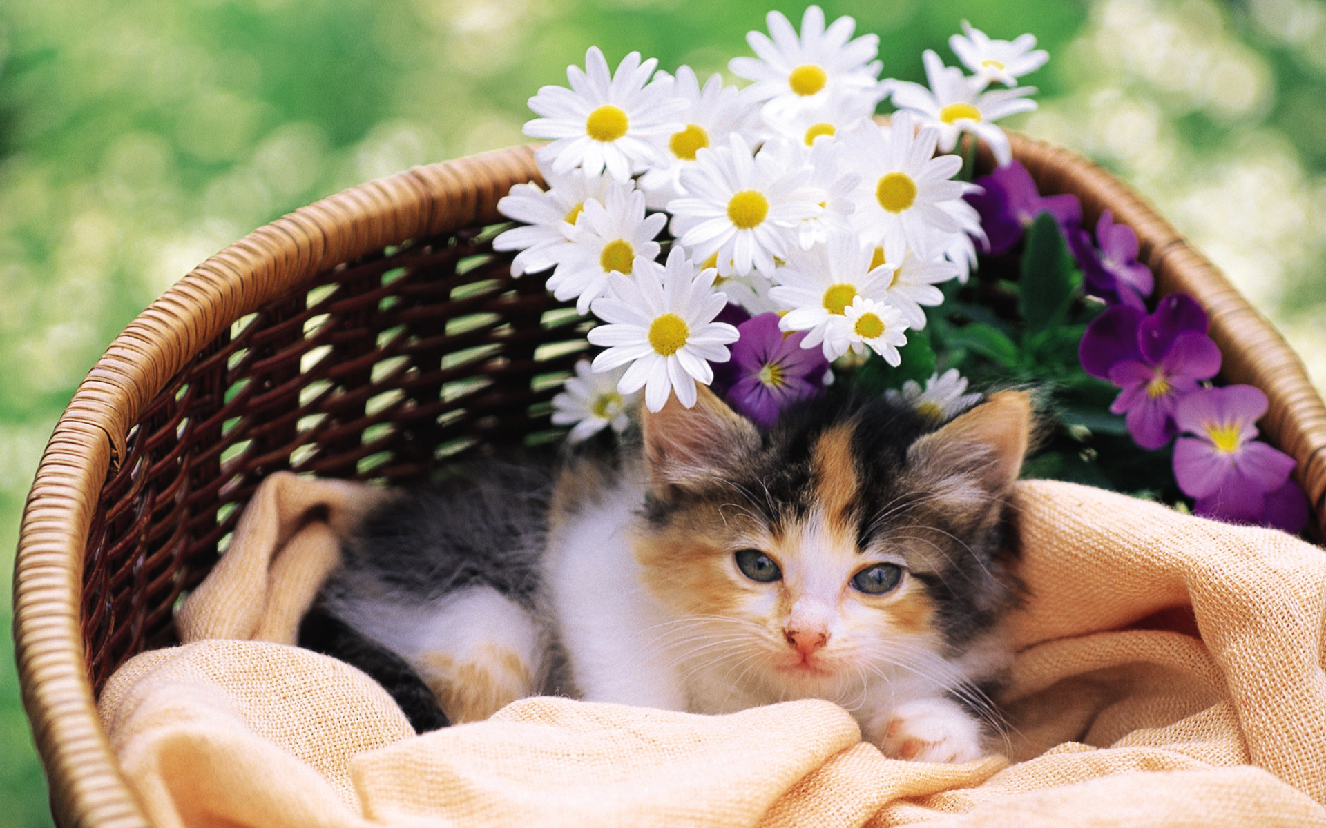 Description: A kitten laying in a basket with flowers in it's head and a blanket on the ground behind it.