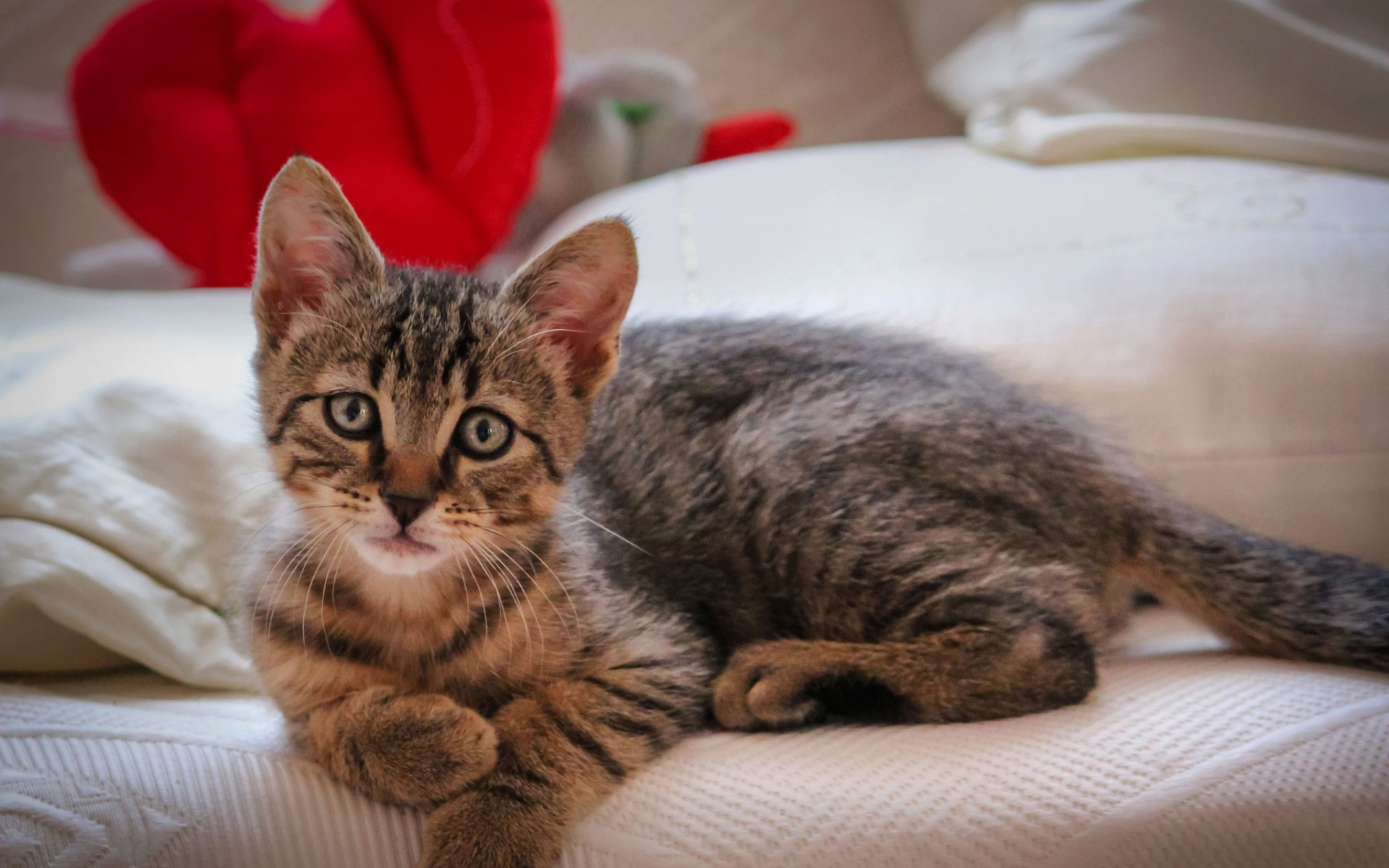 Description: A kitten is laying on a bed with a red heart in the background and a stuffed animal is in the foreground.
