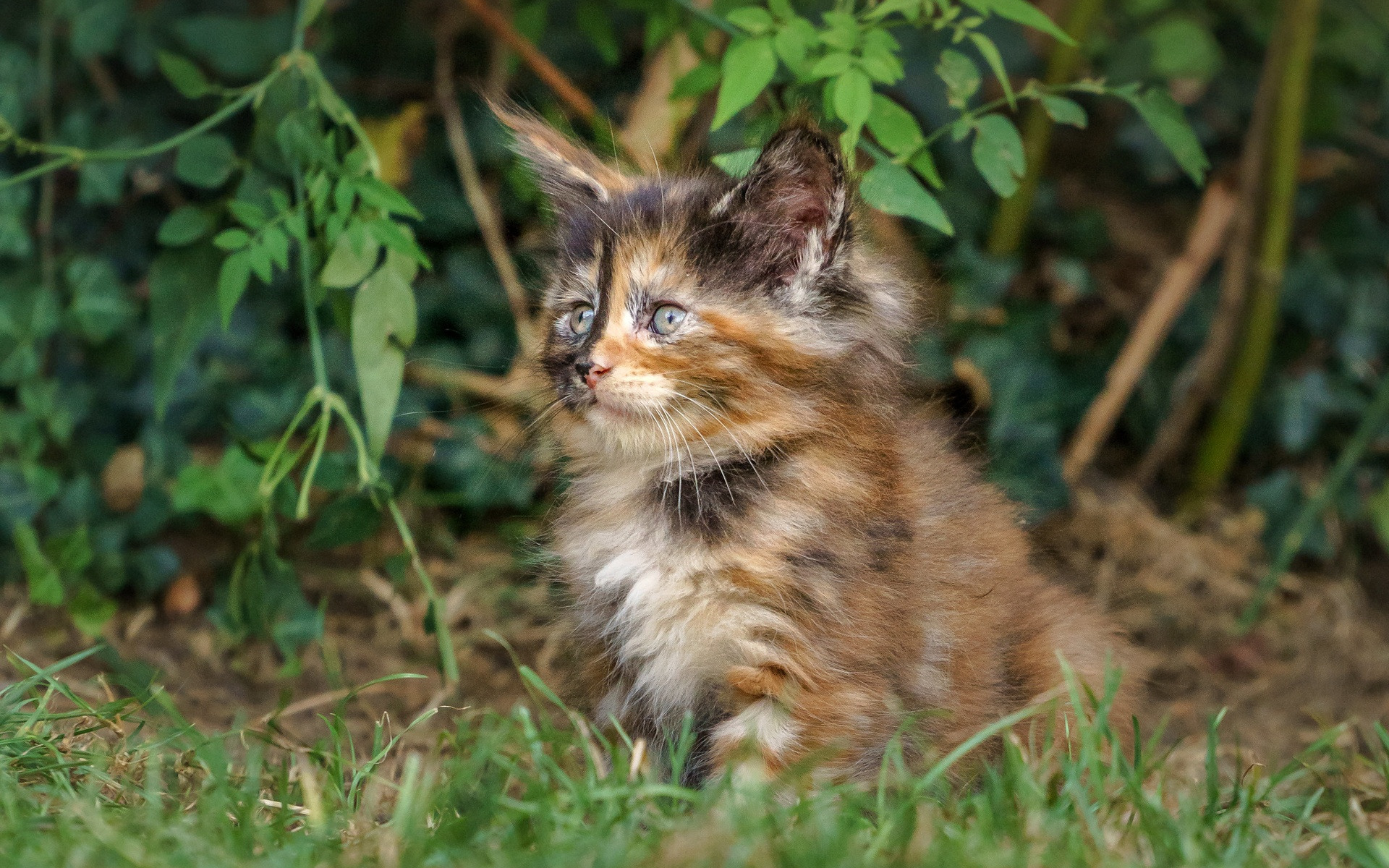 Description: A kitten sitting in the grass looking up at something in the distance with a bush in the background and a bush in the foreground.