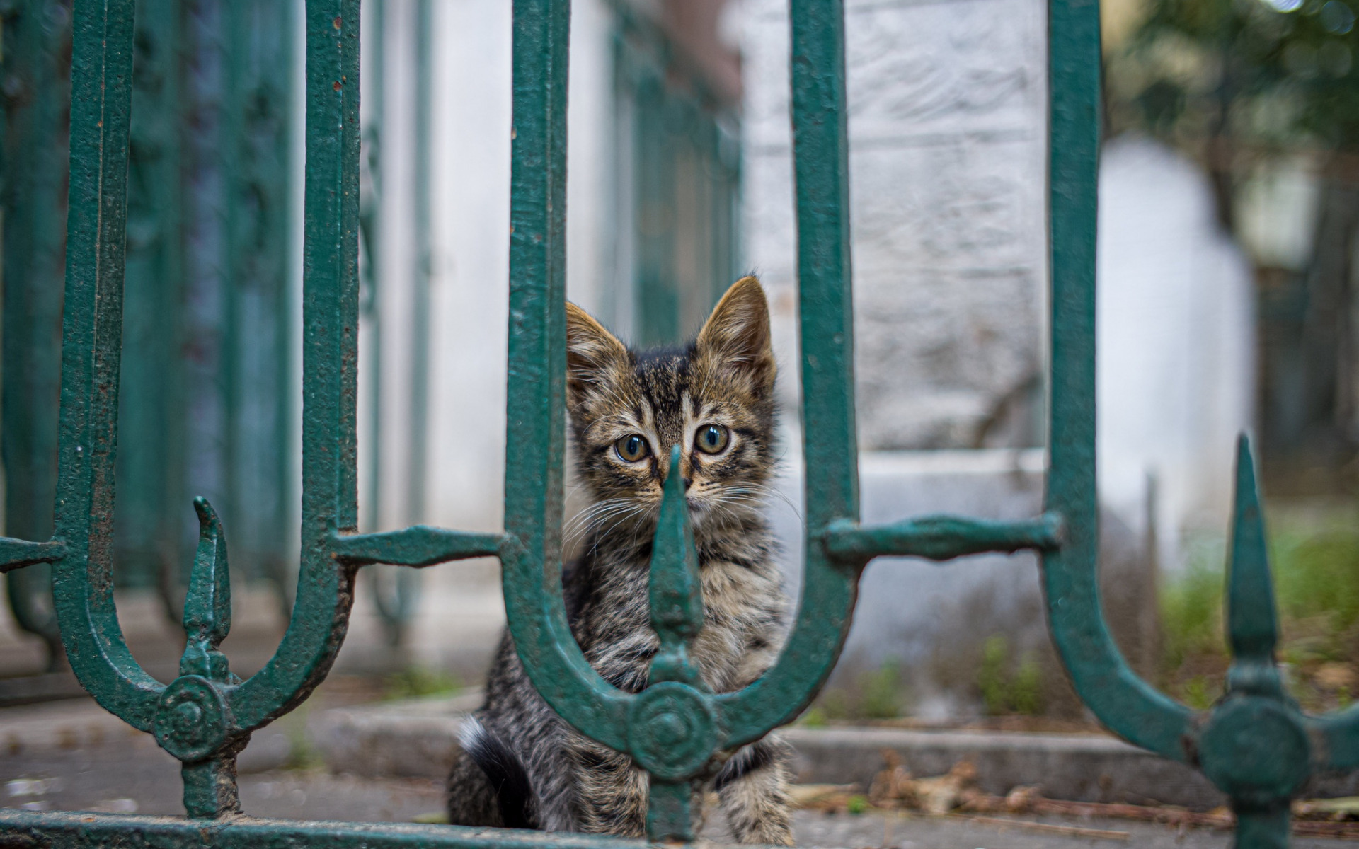 Description: A kitten sitting behind a green gate looking at the camera manoeued in a park area with a building in the background.