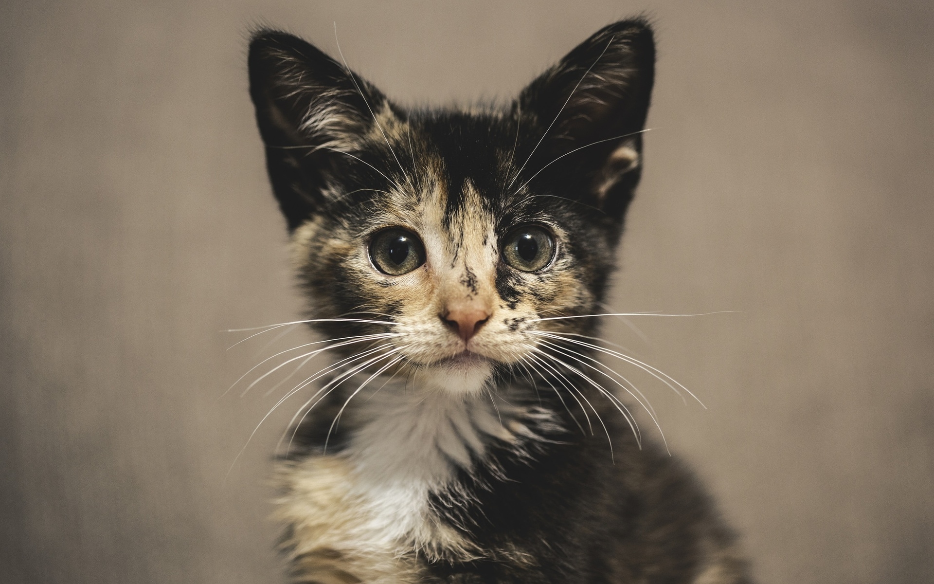 Description: A kitten with a sad look on its face looking at the camera with a serious look on its face.