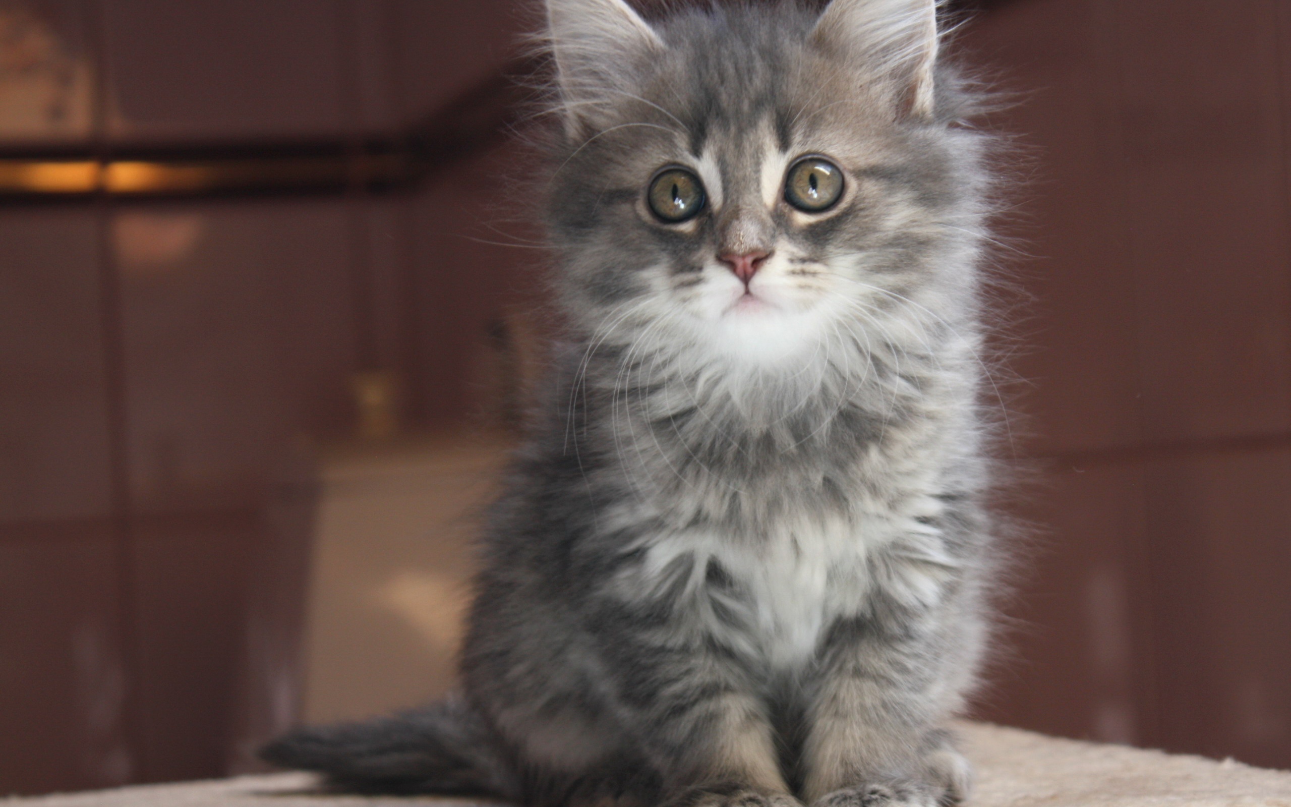 Description: A small kitten sitting on top of a table next to a door and a window sill with a light on.