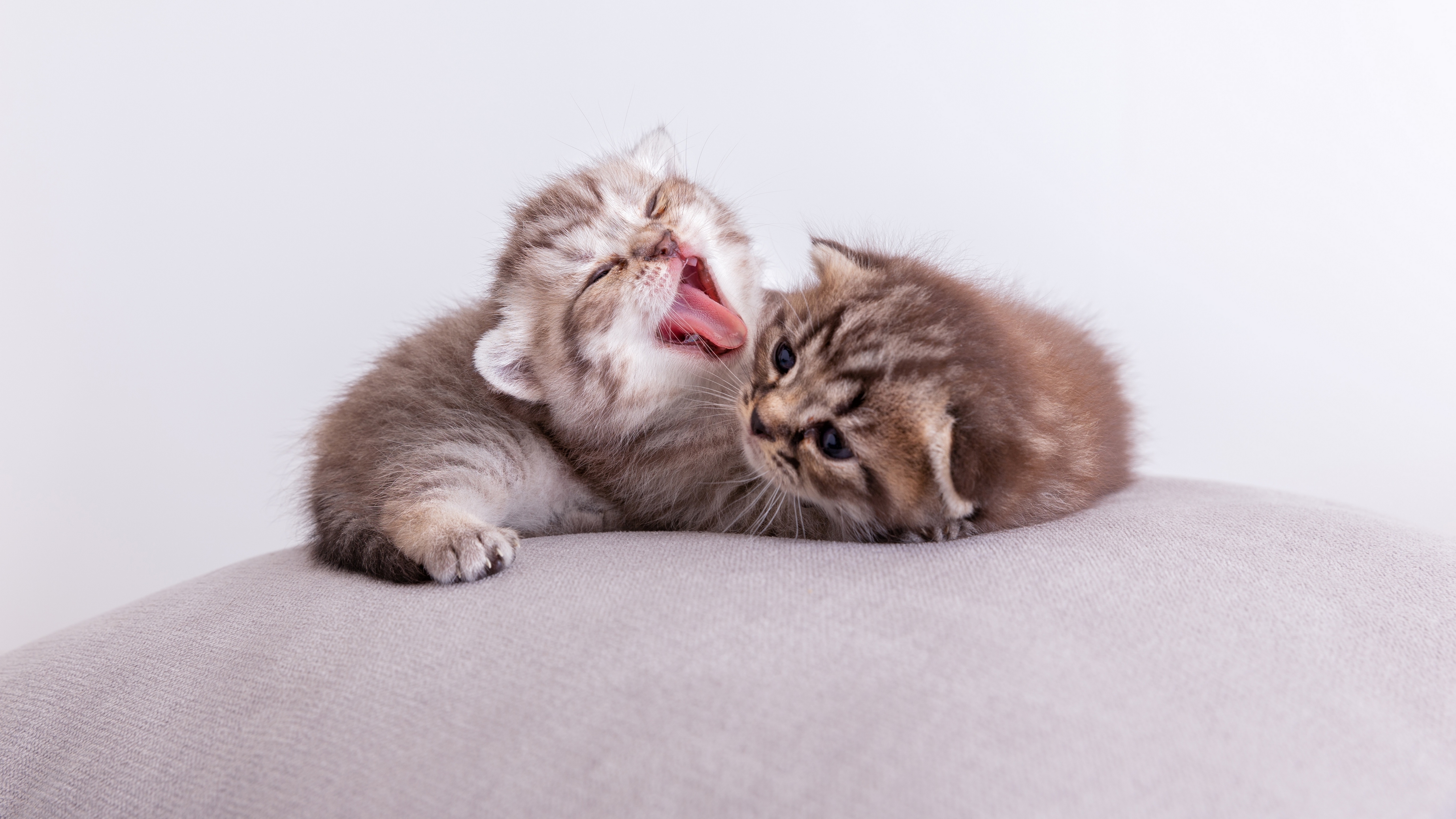 Description: A kitten is laying on its back on a pillow and yawning with its mouth open and tongue out.
