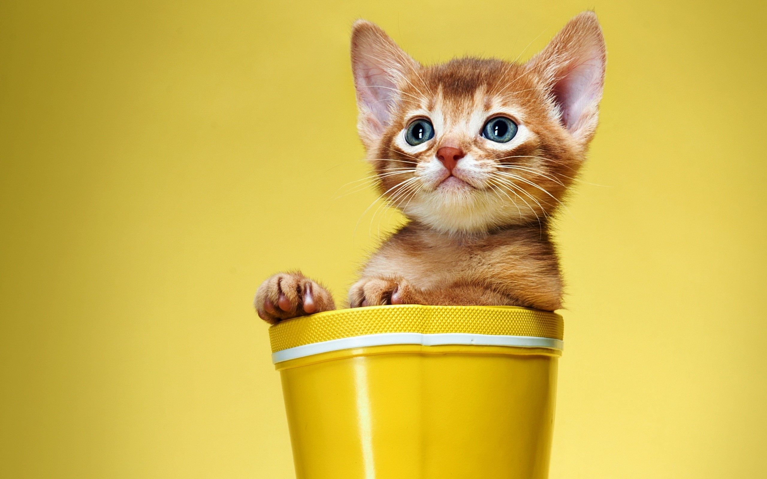 Description: A kitten sitting in a yellow cup with a yellow background and a yellow background behind it.