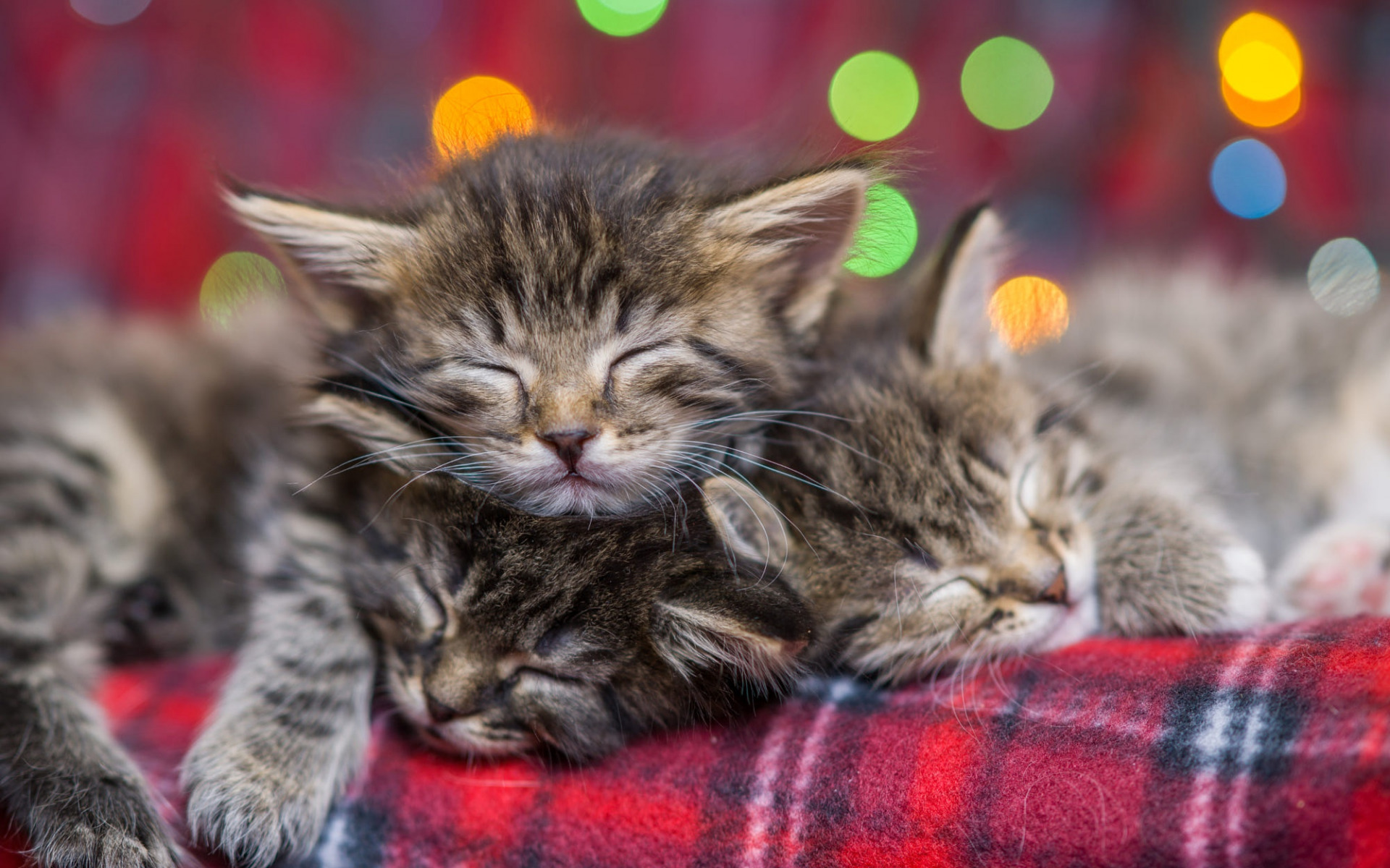 Description: Two kittens are sleeping on a blanket with a christmas light in the background and a blurry background.