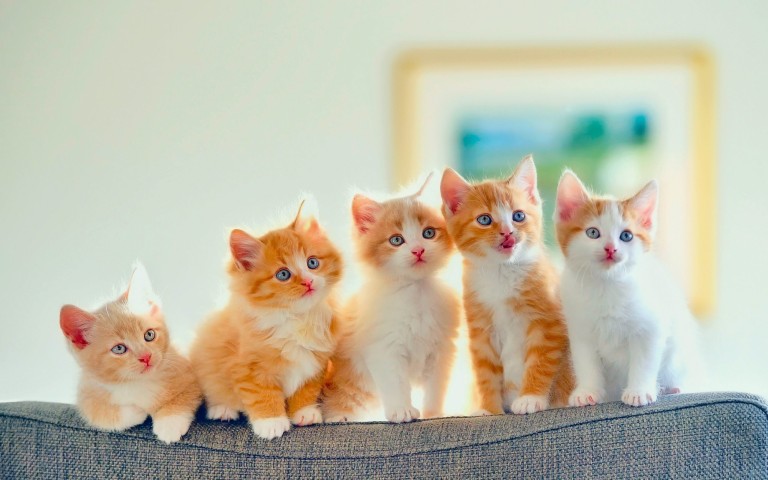 Description: A group of kittens sitting on top of a couch next to each other on a table top in a room.
