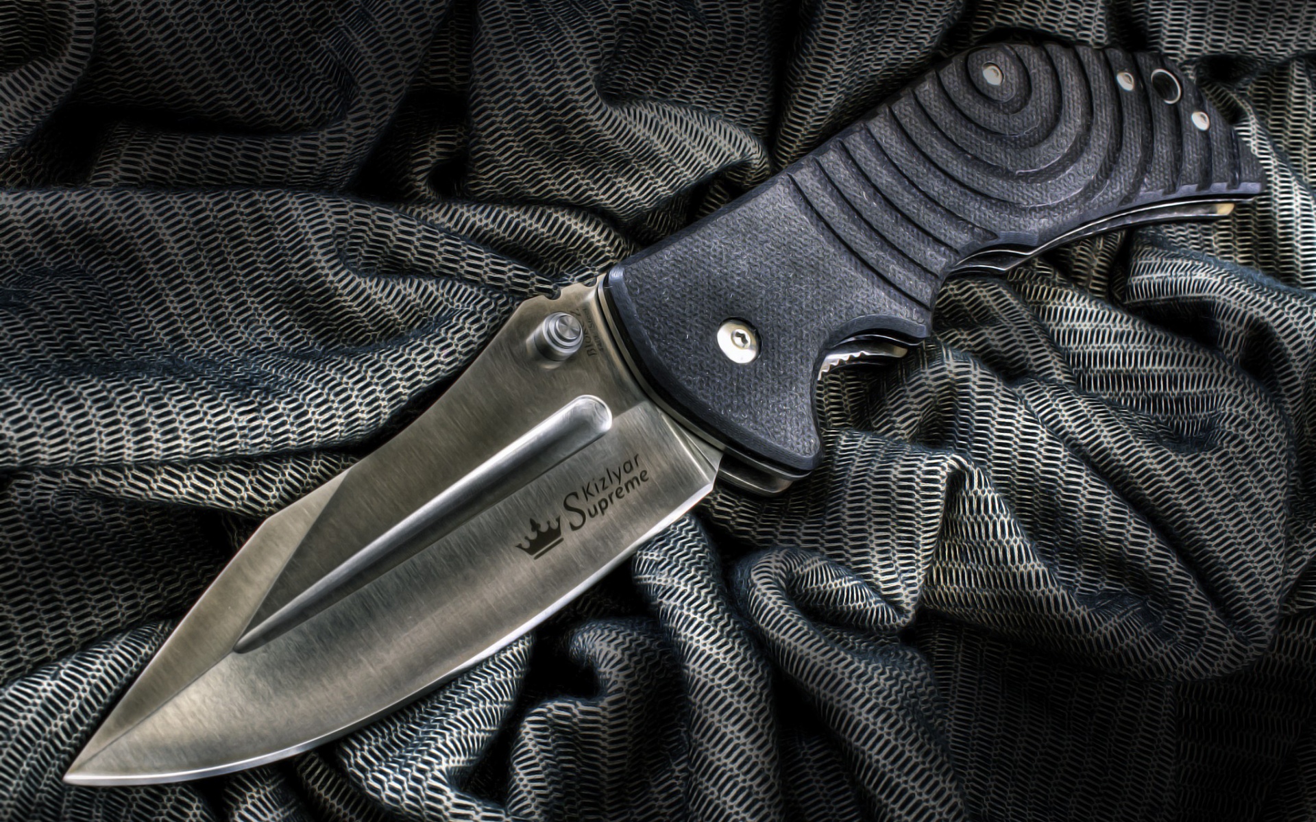 Description: A knife laying on a cloth with a black handle and blade on it's end.