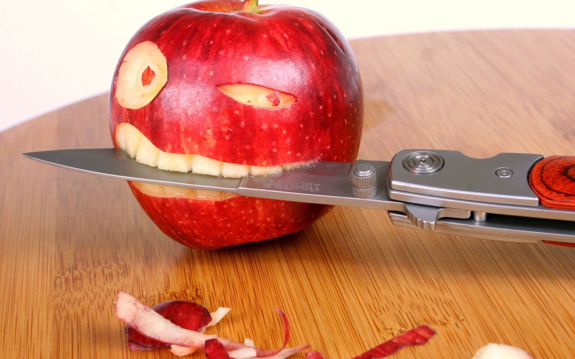 Description: A knife is cutting through an apple with a face on it's side and a whole apple in the background.