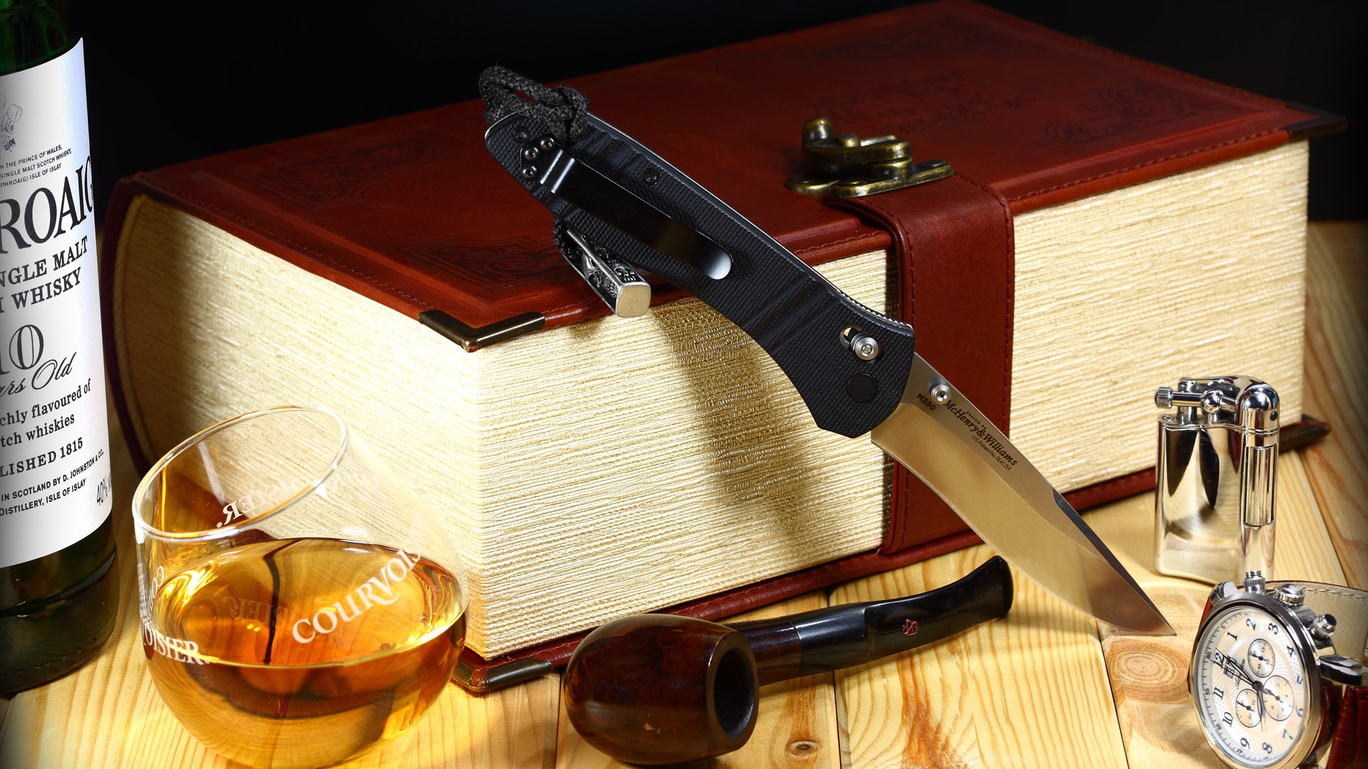 Description: A knife and some glasses on a table next to a bottle of wine and a watch and a watch.