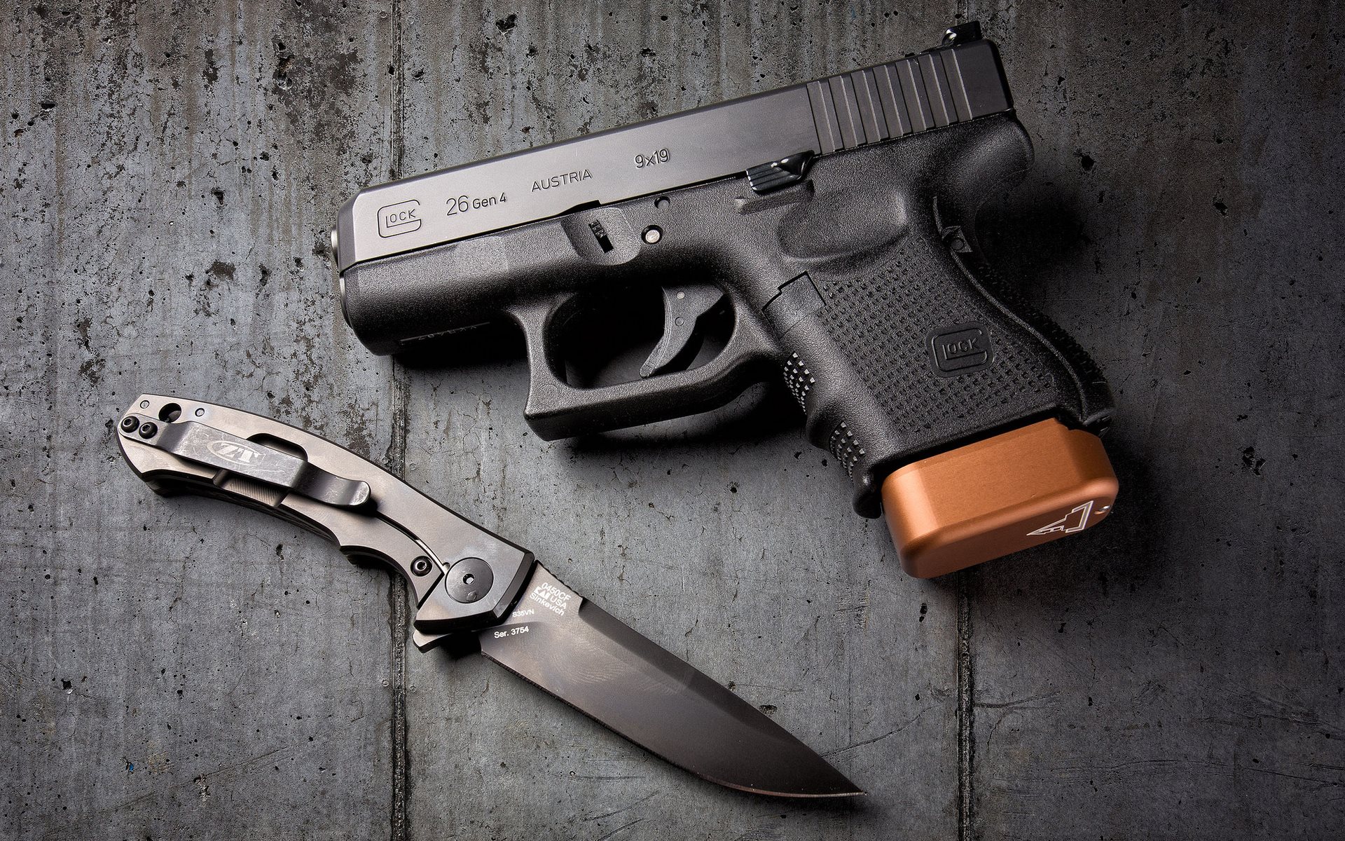 Description: A knife and a gun on a table with a knife and a lighter on it's side.