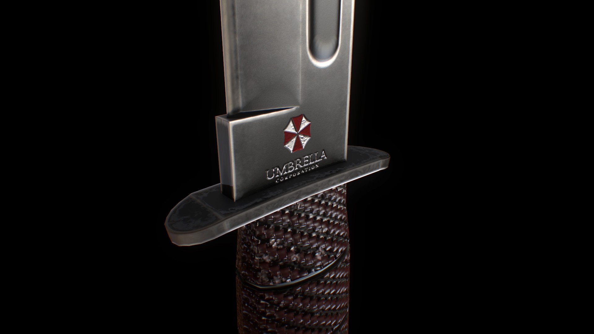 Description: A knife with a blade sticking out of it's blade holder on a black background with a red and white umbrella.