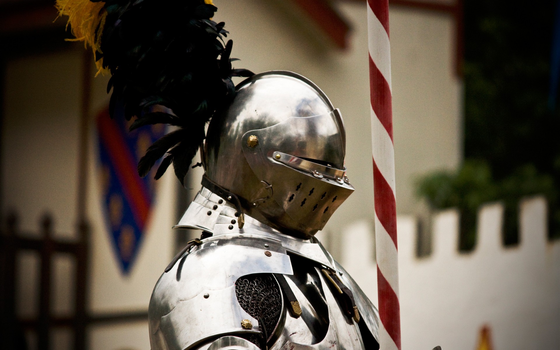 Description: A knight's helmet and armor with a feathered plume on top of it.