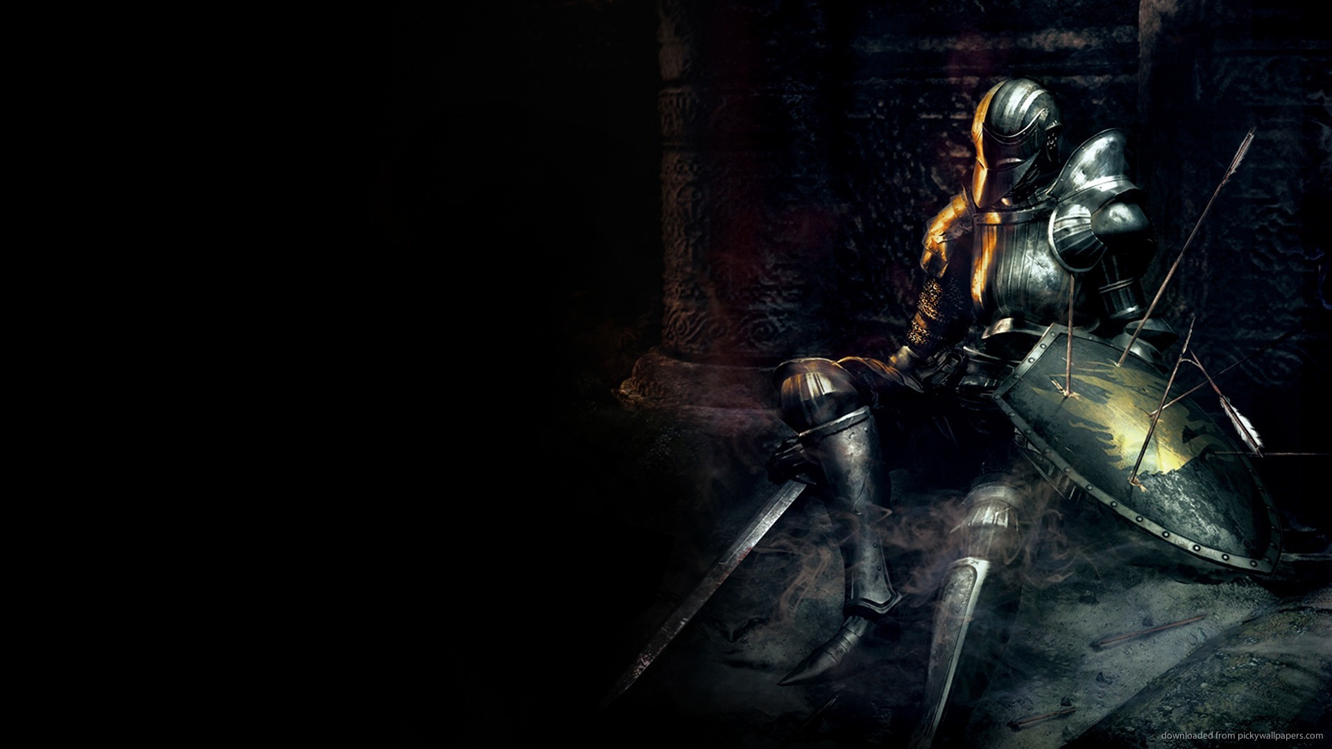 Description: A knight sitting on a chair with a sword in his hand and a shield in his hand.