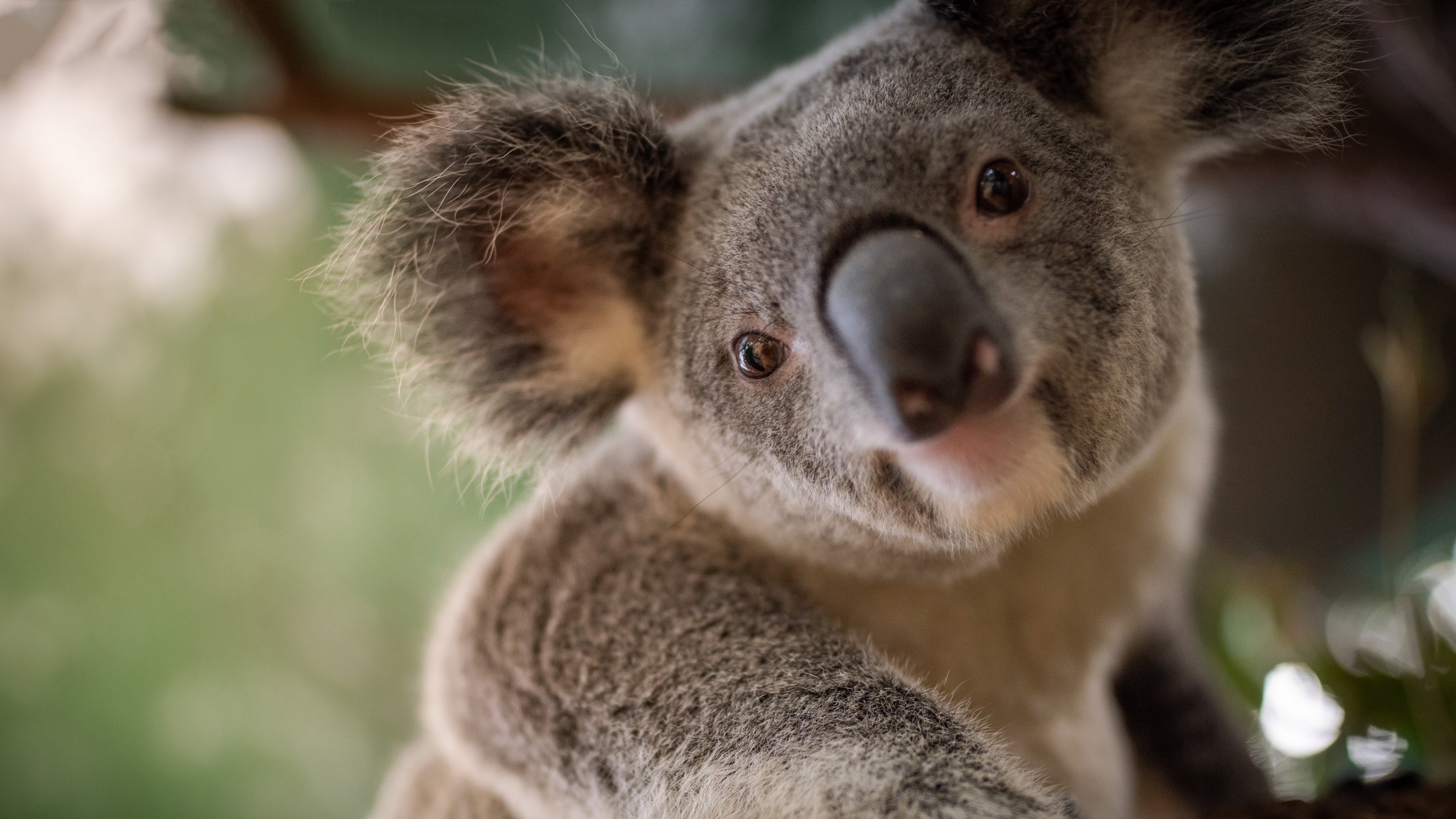 Description: A koala bear sitting in a tree looking at the camera with a blurry background of leaves and branches.