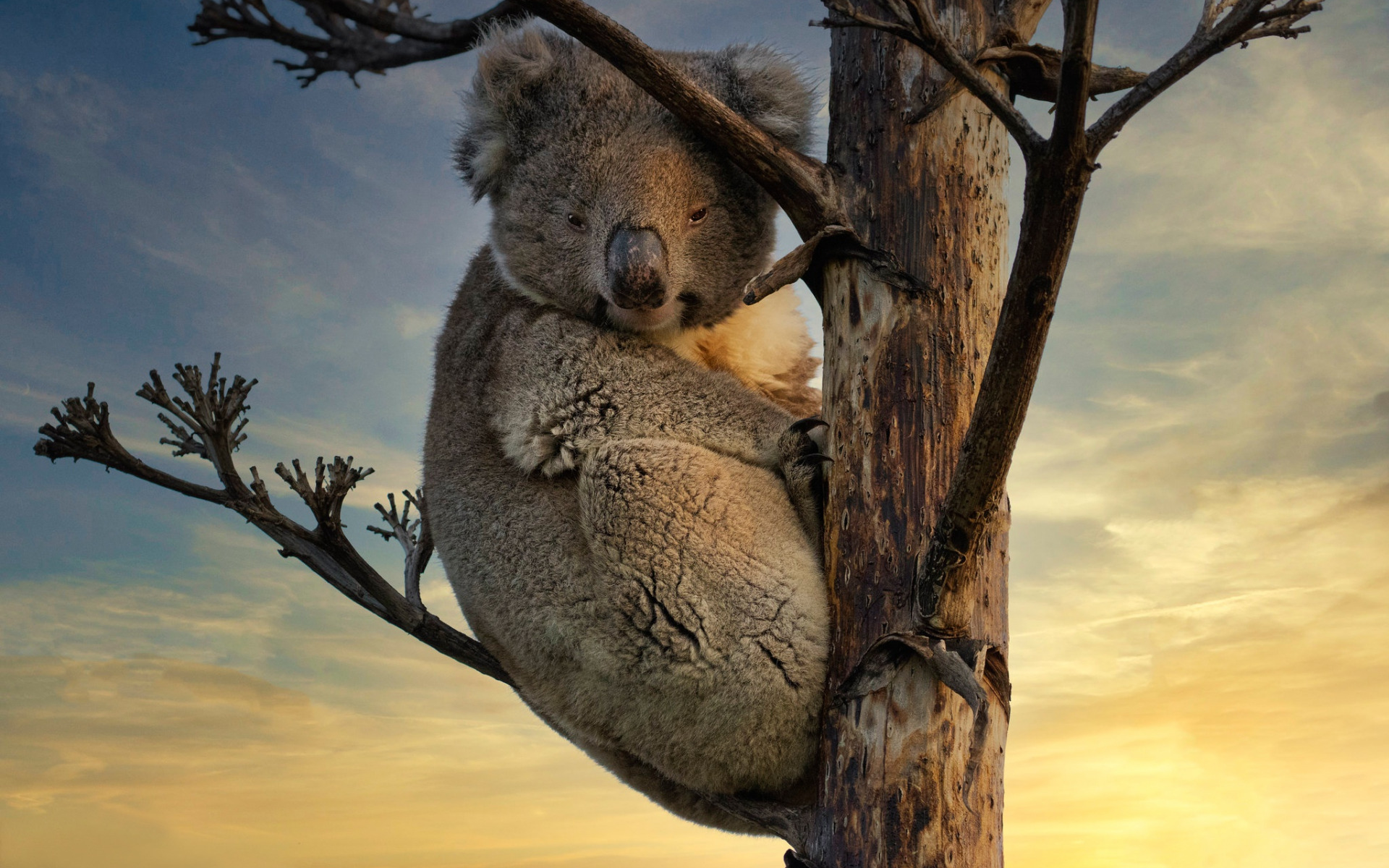 Description: A koala bear sitting in a tree with the sun setting in the background and a blue sky with clouds.