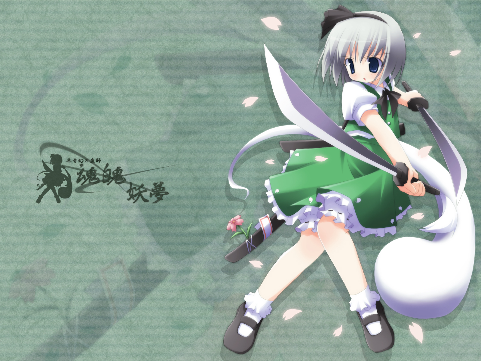 Description: A anime girl with long white hair and green dress holding a sword and a white cat on her lap.