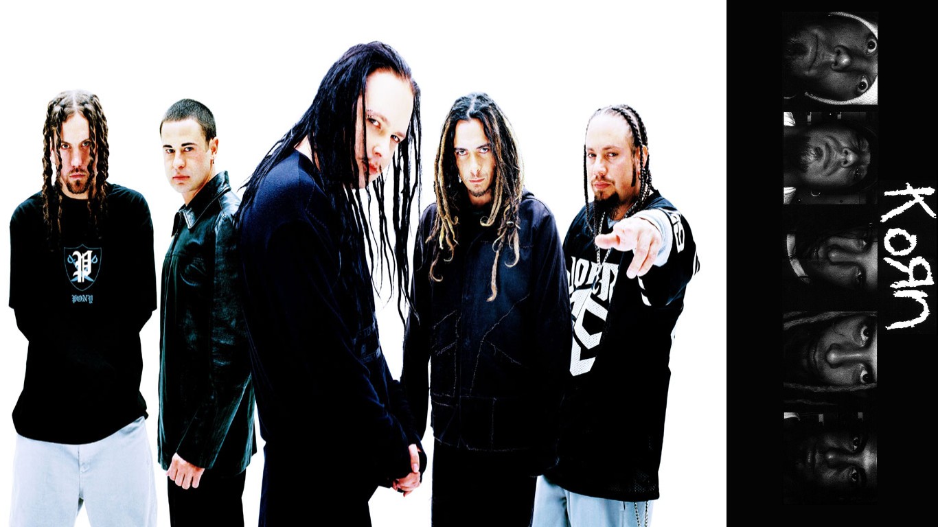 Description: A group of men standing next to each other in front of a white background with the words korn on it.