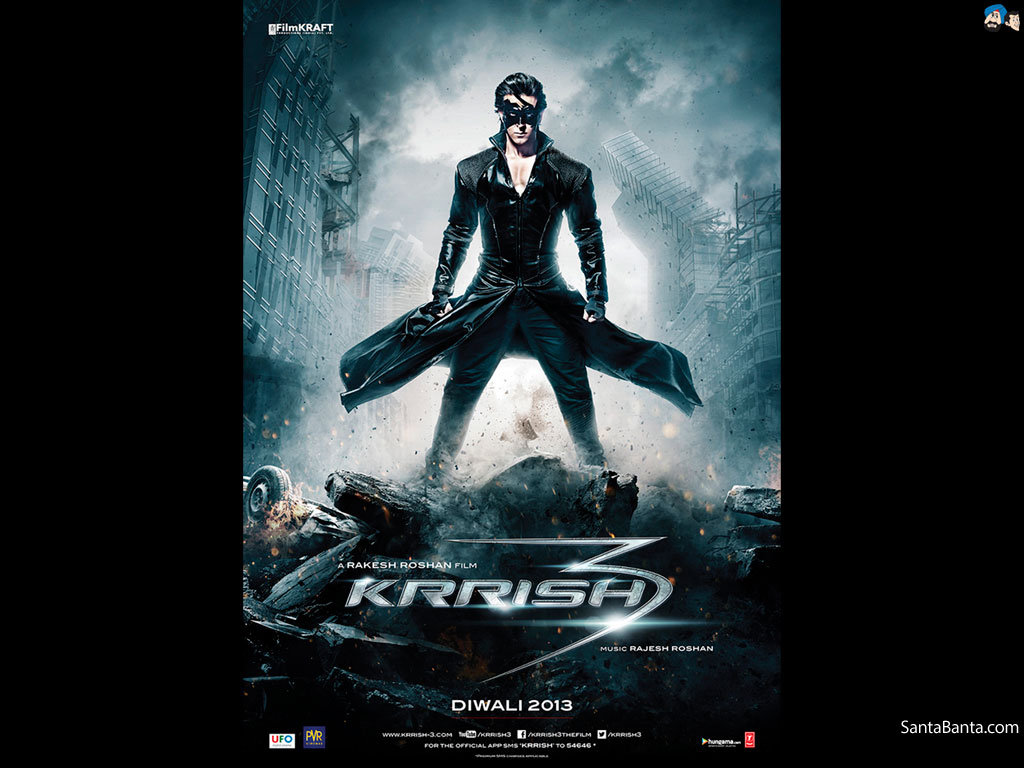 Description: A poster of krrish from the movie krrish 2012 is displayed in a dark room with a black background.